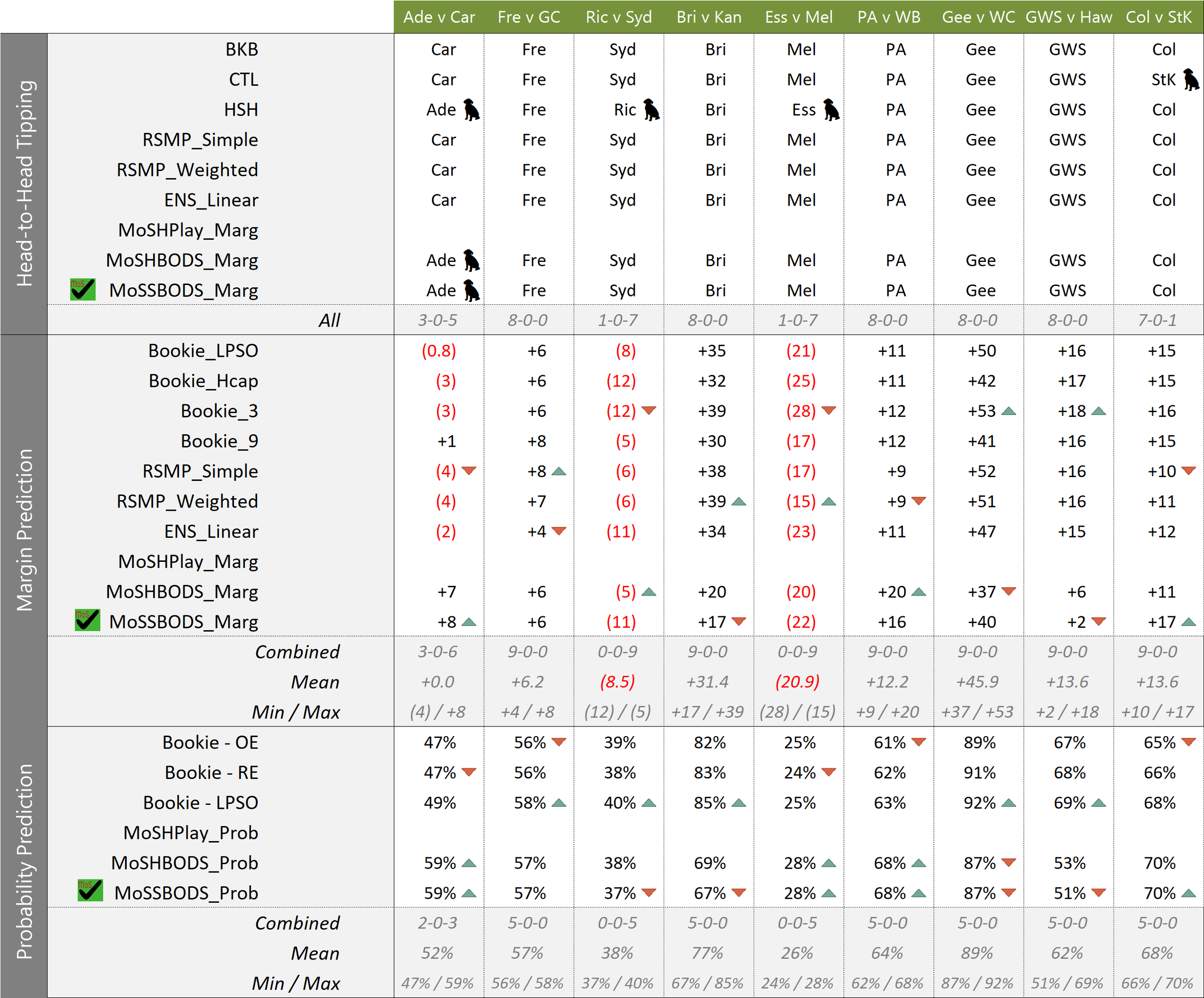 Amongst the Head-to-Head Probability Predictors there are three games with double-digit percentage point ranges: Brisbane Lions v North Melbourne (18% points), GWS v Hawthorn (18% points), and Adelaide v Carlton (12% points).