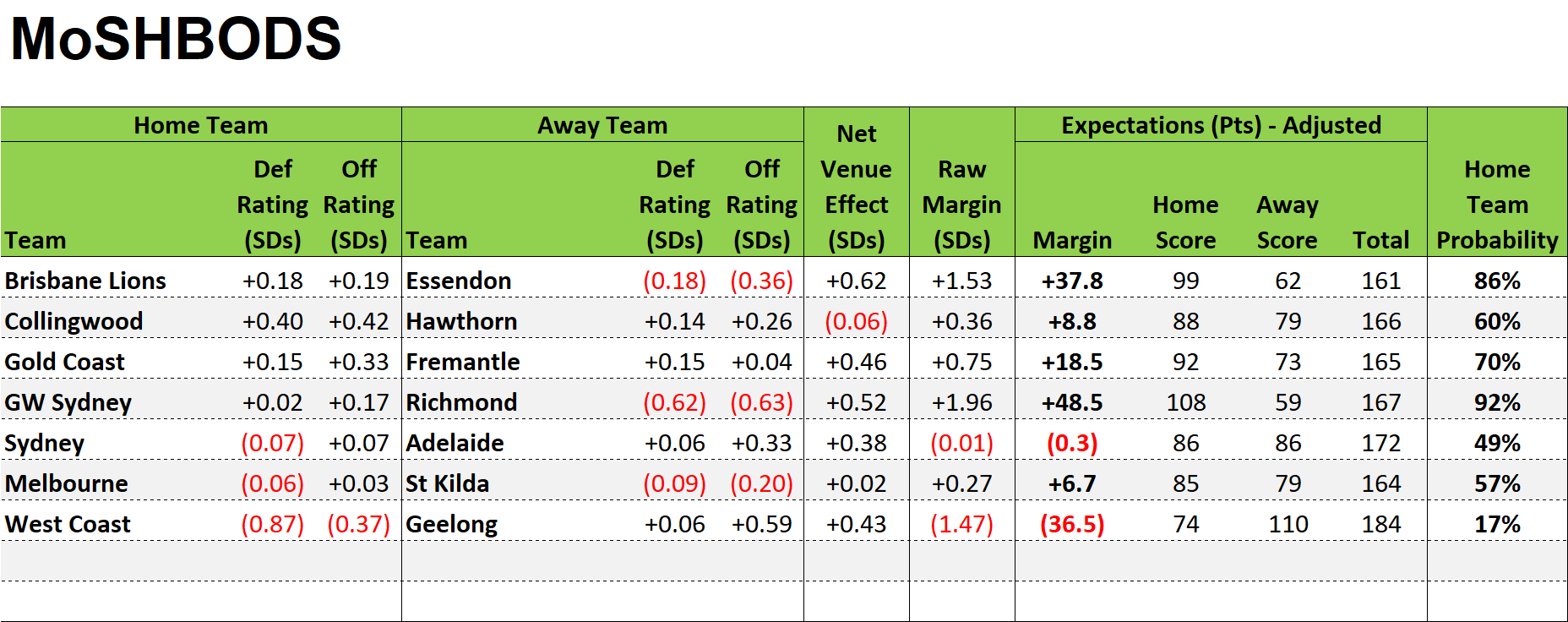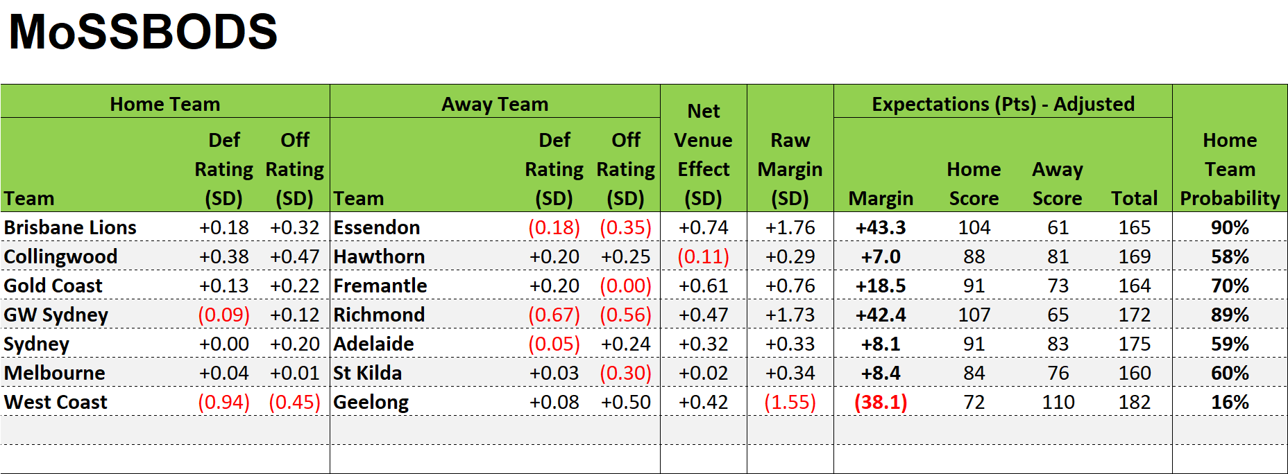 To finish, here are MoSSBODS’ and MoSHBODS’ opinions about likely team scoring.