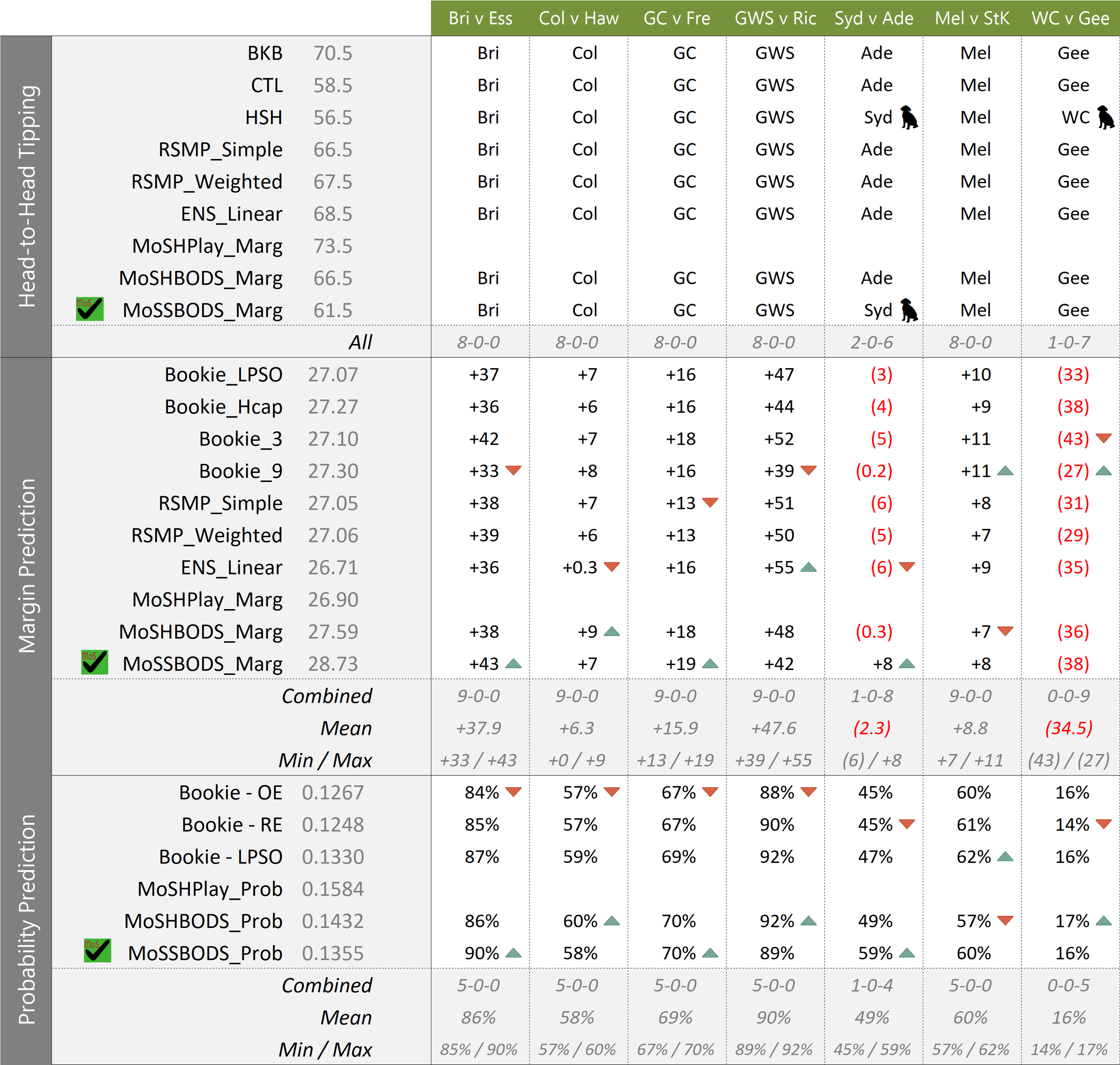 Bookie_9 has Extreme Predictor status in four games this week, and MoSSBODS_Marg and ENS_Linear in three each.
