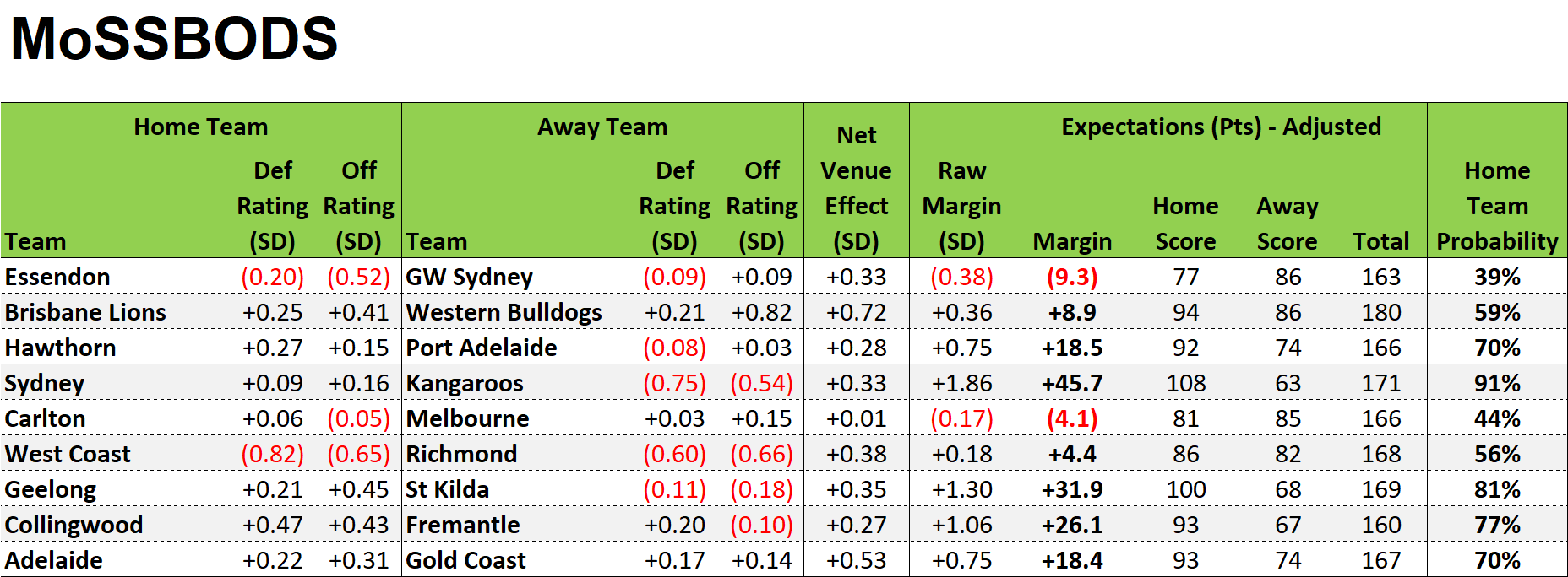 To finish, here are MoSSBODS’ and MoSHBODS’ opinions about likely team scoring.