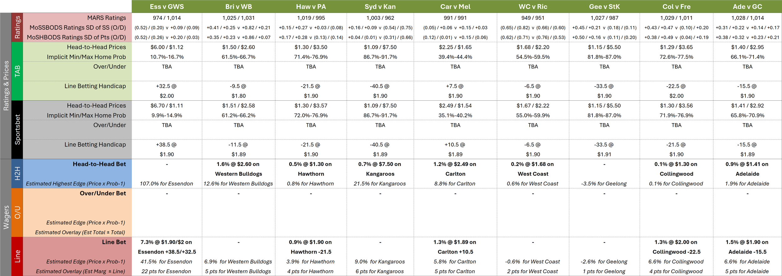 The week’s Ready Reckoner reveals that Essendon, even without a hefty head-to-head wager, carry the most risk in the sense that the difference between a loss by 32 points and a loss by 39 points represents 9% of the original Combined Portfolio. On the same metric Carlton carry 2.3% risk, Adelaide 2.2%, Collingwood 1.8%, Hawthorn and North Melbourne 1.3%, Western Bulldogs 1%, and West Coast 0.1%.