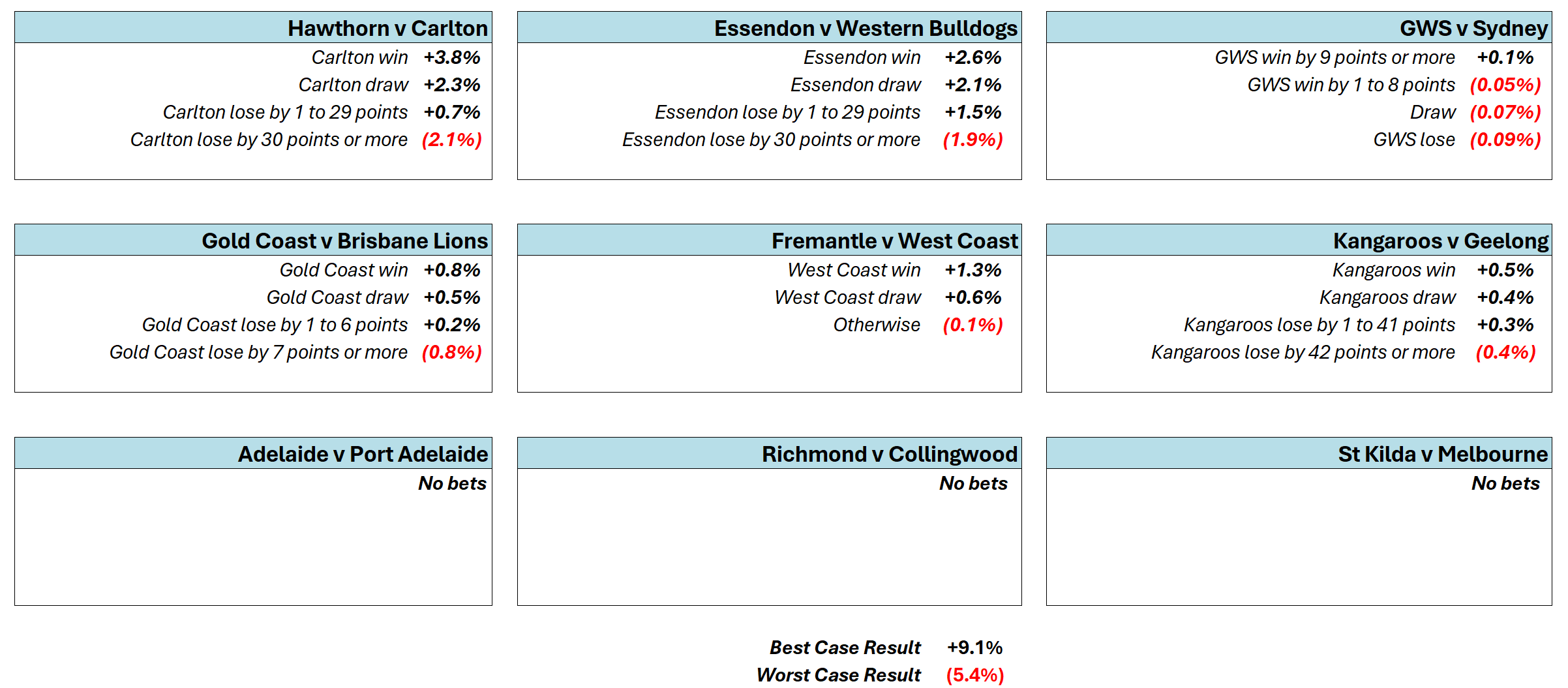 The week’s Ready Reckoner reveals that Carlton, even with its truncated line wager, carries the most risk in the sense that the difference between a loss by 30 points and a win represents 5.9% of the original Combined Portfolio. On the same metric Essendon carry 4.5% risk, Gold Coast 1.6%, West Coast 1.4%, North Melbourne 0.9%, and GWS 0.2%.
