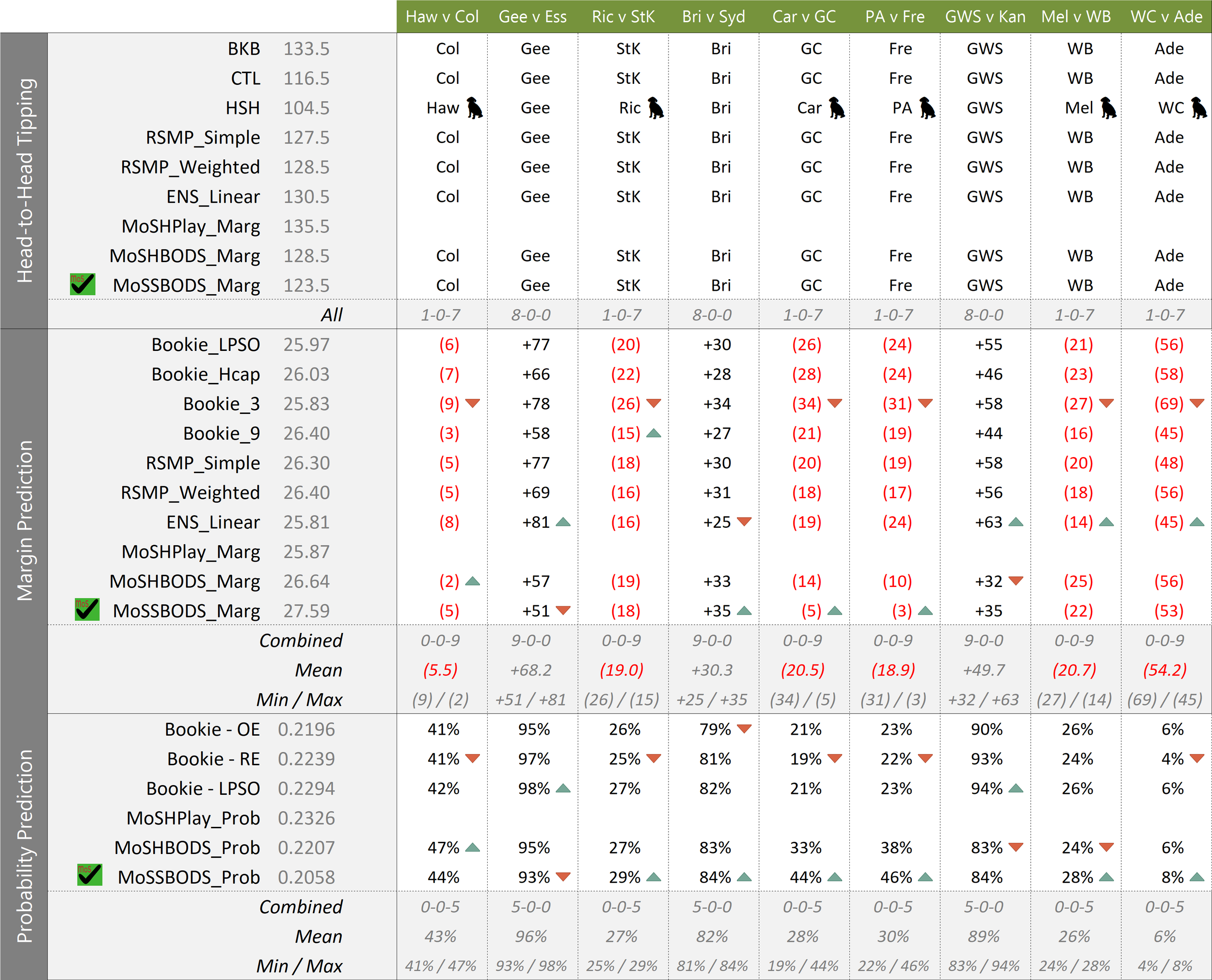 Amongst the Head-to-Head Probability Predictors there are three games with a double-digit percentage point forecast range, most notably 25% points in the Blues v Suns game, and 24% points in the Power v Dockers game.