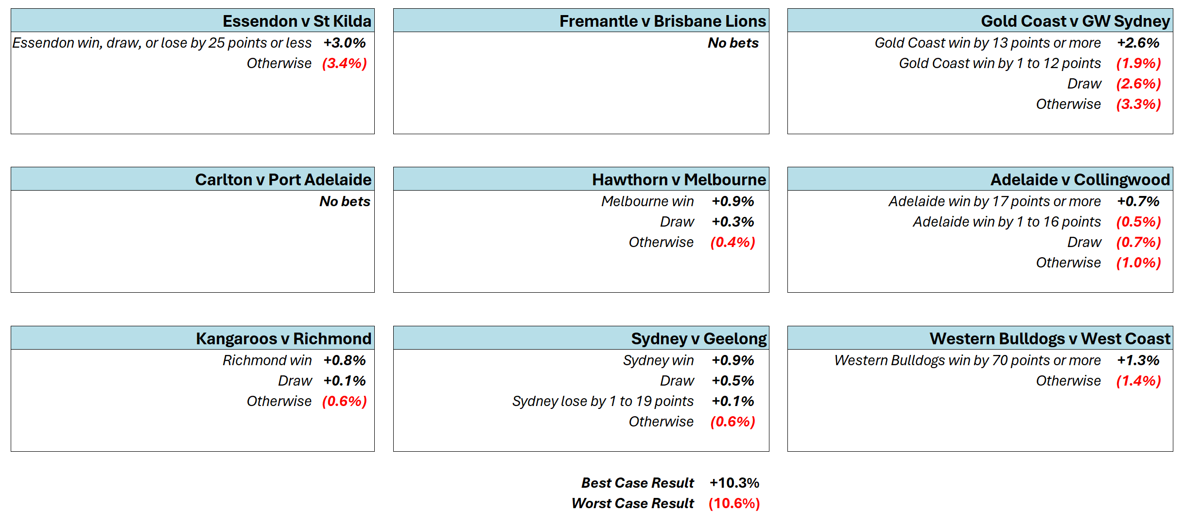 Those line bets are joined by five head-to-head wagers totalling just under 10% of the original Line Fund in sizes ranging from 0.9% on Sydney to 3.9% on Gold Coast.