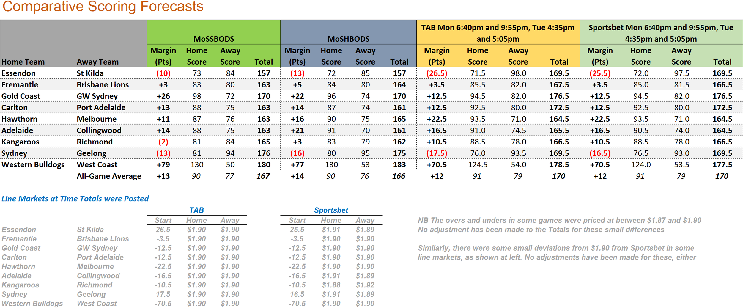 There were three bets last weekend, two successful unders wagers with the TAB, and one successful overs wager with Sportsbet, which left MoSSBODS with a 16 and 15 season-long record against the TAB, and a 7 and 6 season-long record against Sportsbet.