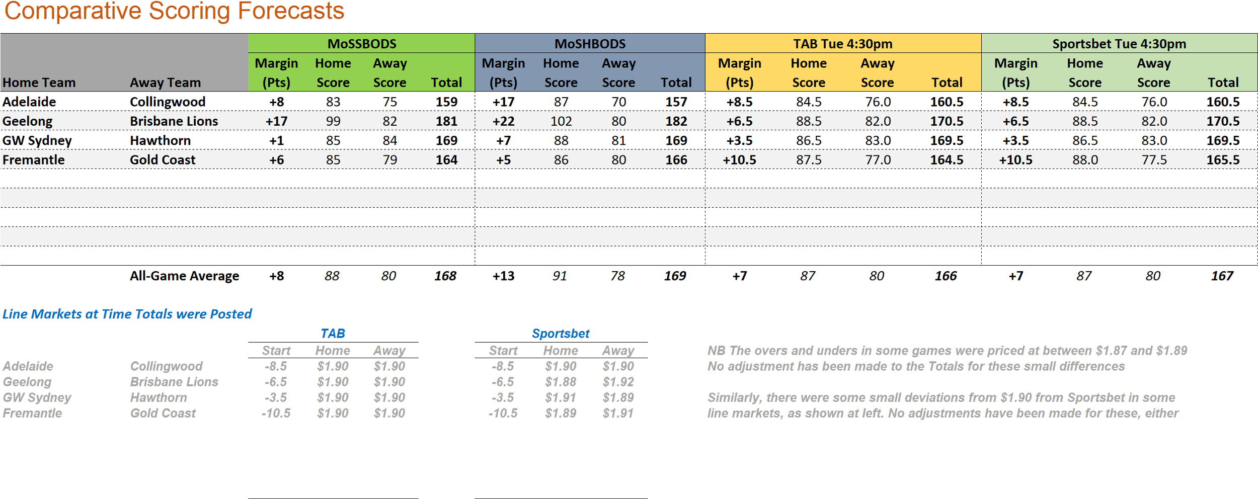 /There are four games this week, and the MoS twins have relatively similar views about the likely total scores in all of them, differing by no more than a couple of points in any single game.