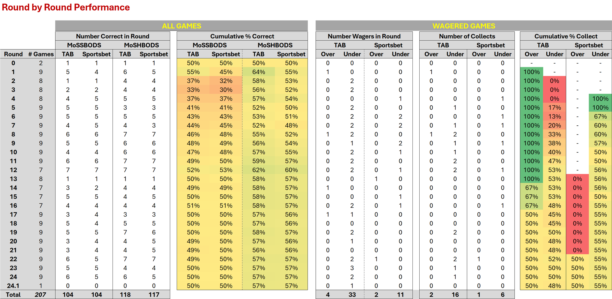 That took MoSSBODS to 104 from 207 (50%) against the TAB and Sportsbet, and MoSHBODS to 118 from 207 (57%) against the TAB and 117 from 207 (57%) against Sportsbet.