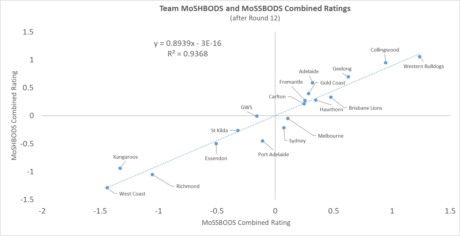 The correlation between MoSSBODS and MoSHBODS Combined Ratings now stands at +0.968 and, roughly speaking, each team’s Combined MoSHBODS Rating is about 0.89 times its Combined MoSSBODS Rating.