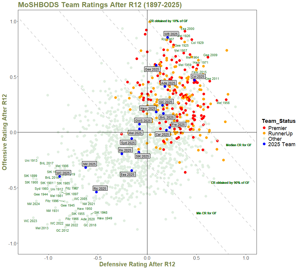 To put the latest MoSHBODS Ratings in some historical context, here are the Ratings of teams across V/AFL history as at the end of their respective Round 12s.