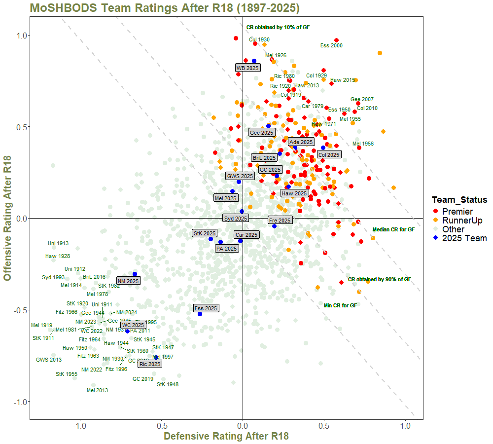 To put the latest MoSHBODS Ratings in some historical context, here are the Ratings of teams across V/AFL history as at the end of their respective Round 18s.