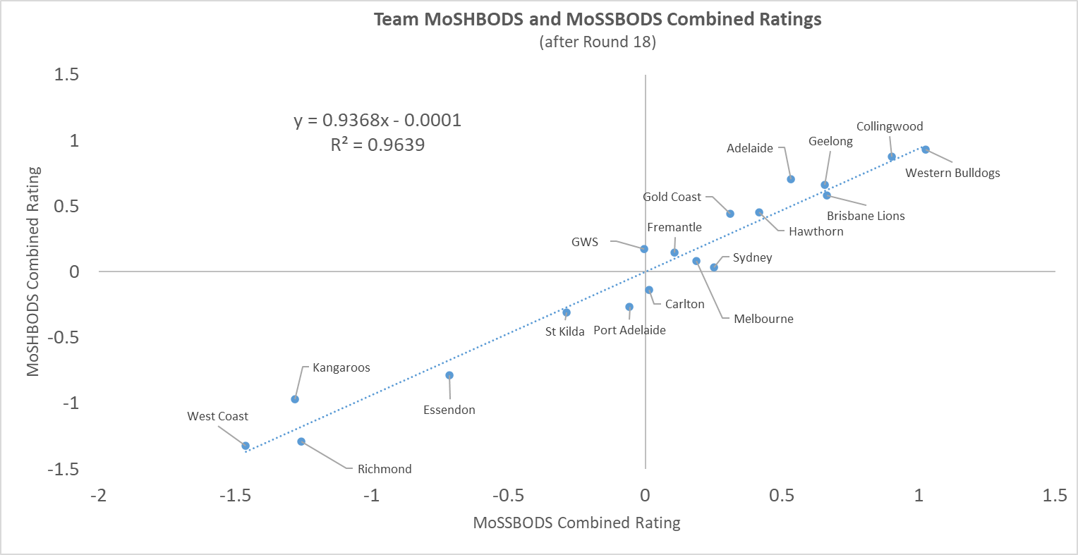 The correlation between MoSSBODS and MoSHBODS Combined Ratings now stands at +0.98 and, roughly speaking, each team’s Combined MoSHBODS Rating is about 0.94 times its Combined MoSSBODS Rating.