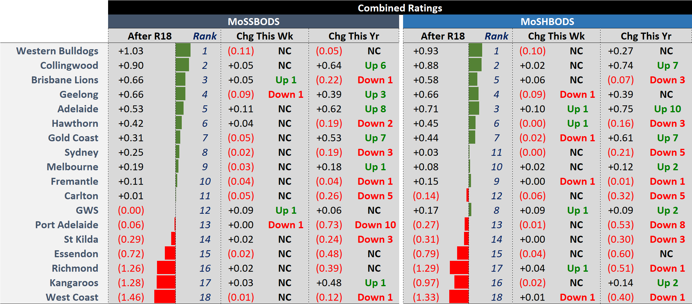 Overall, MoSSBODS still has 11 teams rated as above average, as does MoSHBODS, although MoSHBODS swaps in GWS for Carlton.