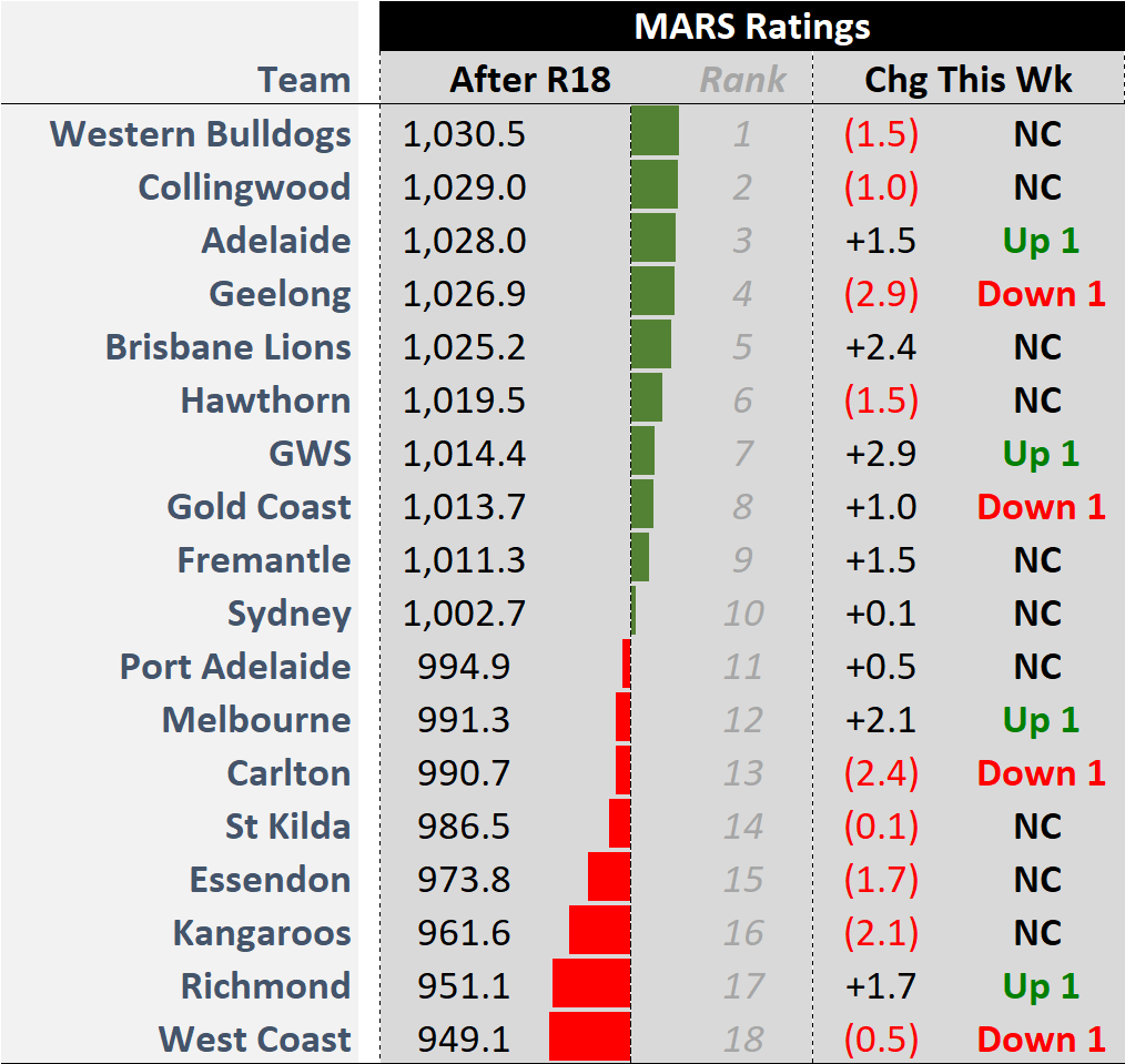 And, finally, it’s time to take a look at MARS, which re-ranked eight teams this week, swapping Adelaide into 3rd at the expense of Geelong, GWS into 7th at the expense of Gold Coast, Melbourne into 12th at the expense of Carlton, and Richmond into 17th at the expense of West Coast.