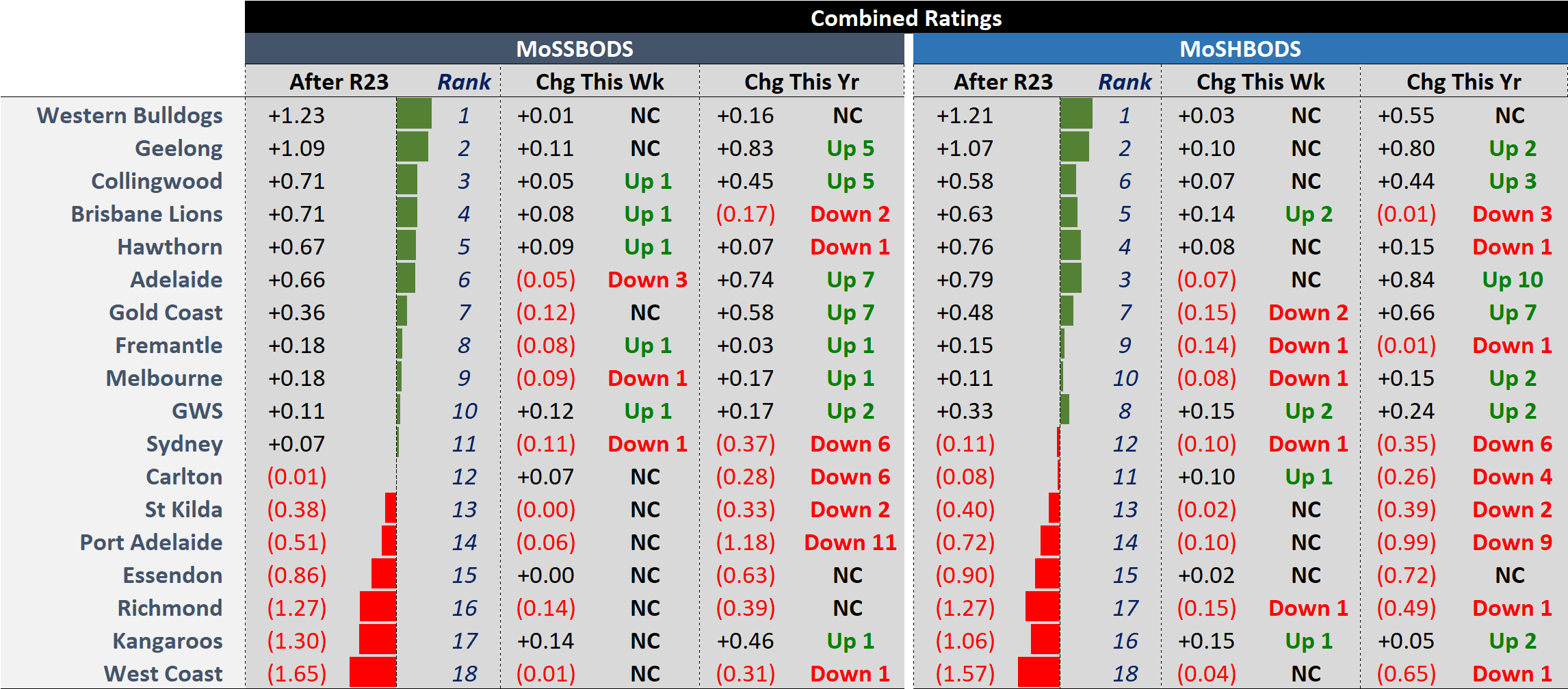 /MoSSBODS moved seven teams this week, while MoSHBODS moved nine, though both, interestingly, increased the Pies’ Combined Rating and decreased the Crows’, despite the Crows winning 59 to 56.