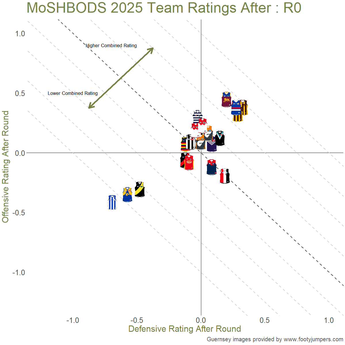 On MoSHBODS, 9 teams are now rated positively on offence and defence (up 1), 7 are rated negatively on both (up 1), one is rated positively on offence but negatively on defence (down 1), and one more is rated negatively on offence but positively on defence (down 1).