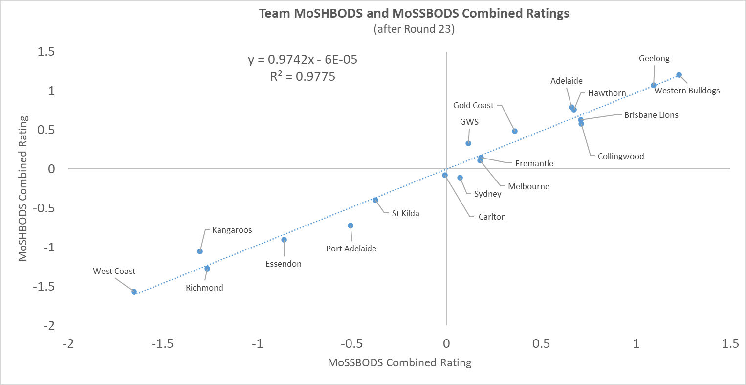 The correlation between MoSSBODS and MoSHBODS Combined Ratings now stands at +0.989 and, roughly speaking, each team’s Combined MoSHBODS Rating is about 0.97 times its Combined MoSSBODS Rating.