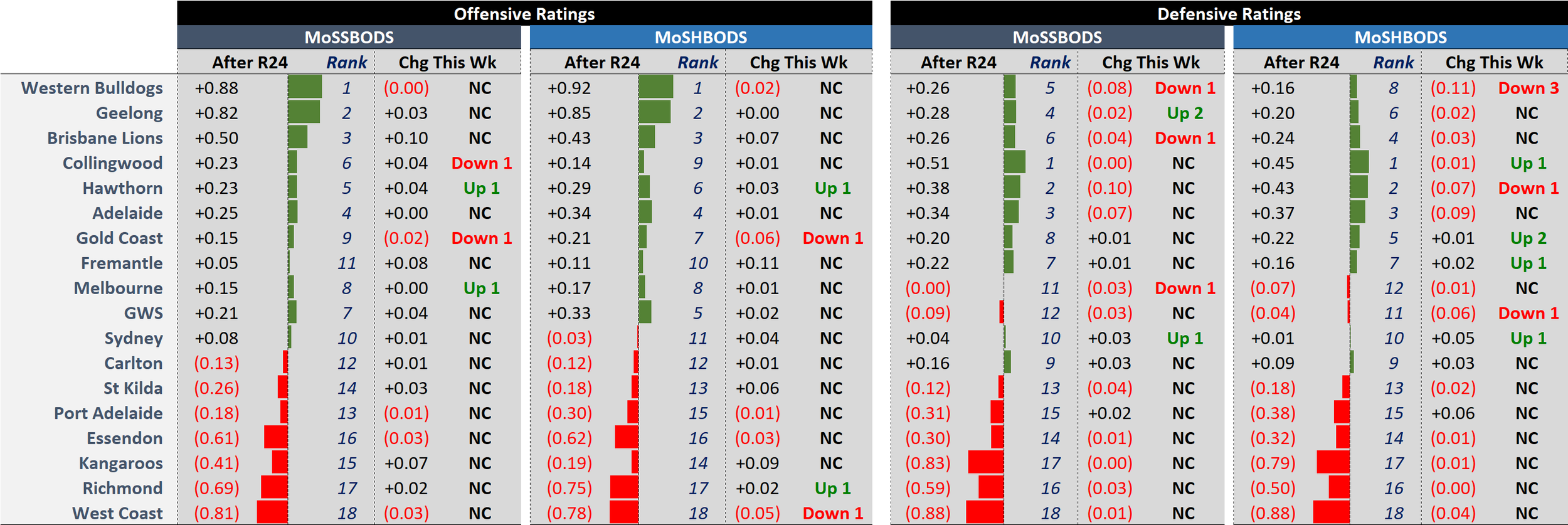 MoSSBODS has 11 teams rated as above average on offence, while MoSHBODS has 10, with the latter dropping Sydney. On defence, MoSSBODS has 10 teams rated as above average on defence, as does MoSHBODS.