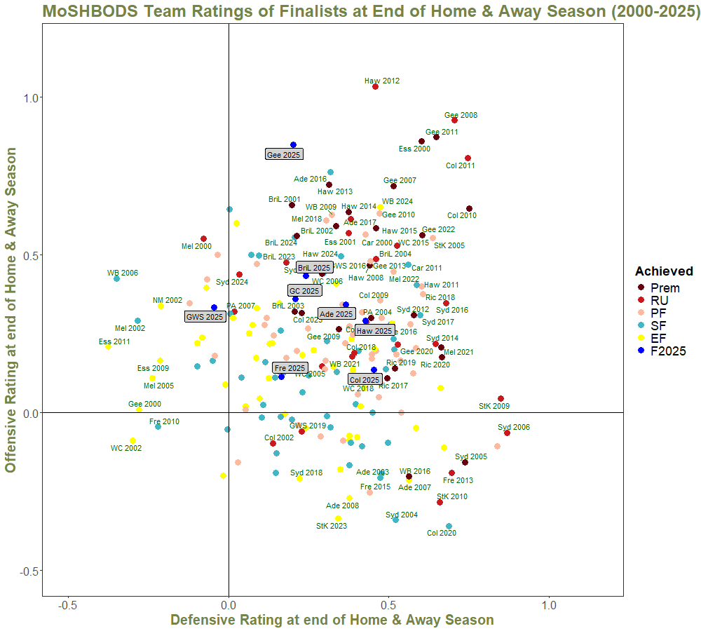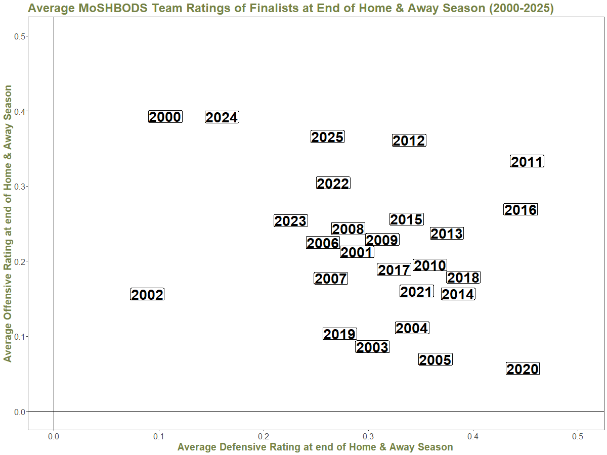 From this we can see that the 2025 finalists are relatively strong offensively, but somewhat weaker defensively.