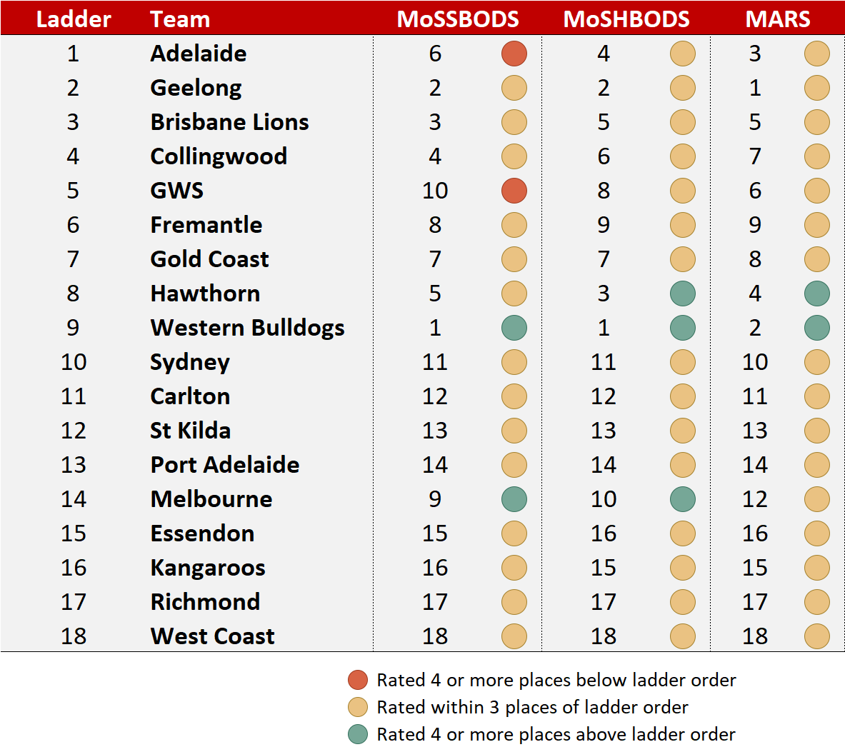 LOWER ON LADDER THAN ON RANKING SYSTEMS: Western Bulldogs, Hawthorn, and Melbourne (ignoring MARS).