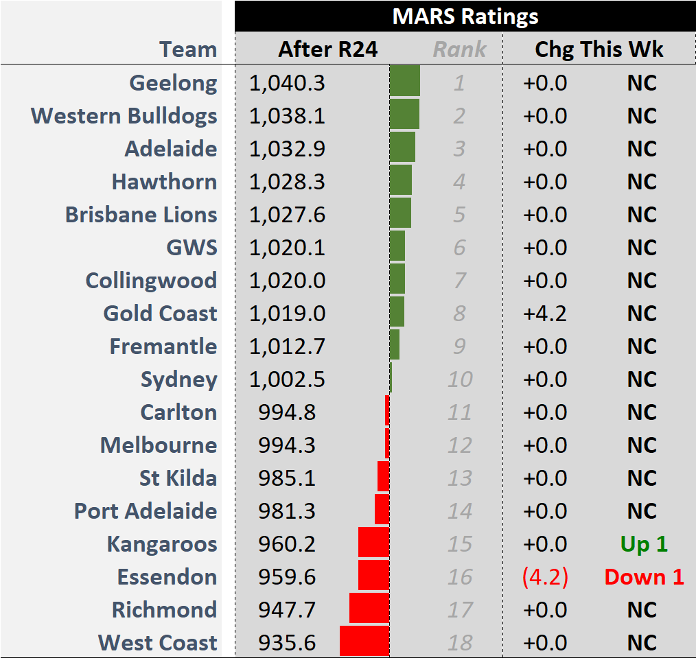 There are now 10 teams rated better-than-average by MARS, after which there is a large gap to Carlton’s 994.8.