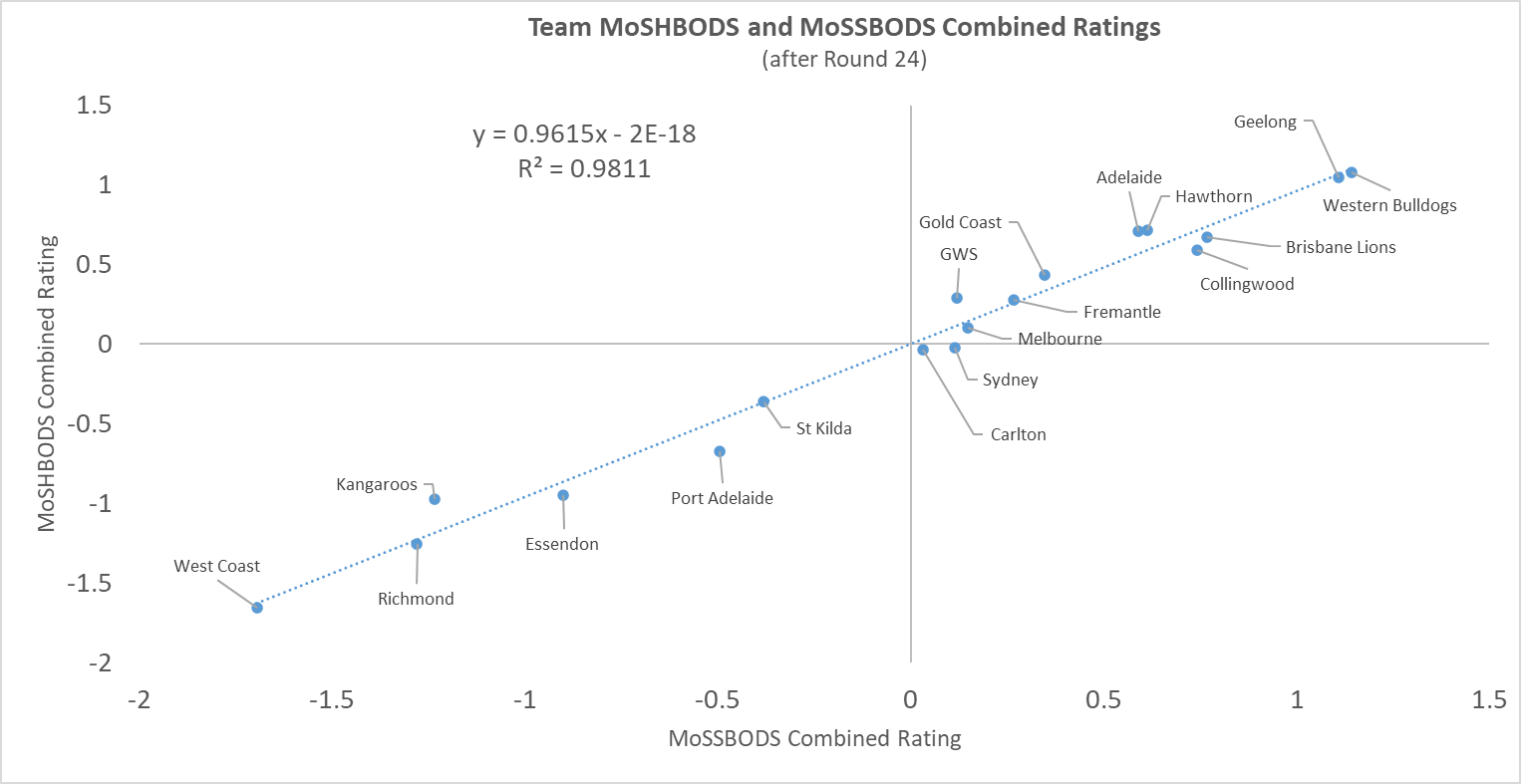 The correlation between MoSSBODS and MoSHBODS Combined Ratings now stands at +0.99 and, roughly speaking, each team’s Combined MoSHBODS Rating is about 0.96 times its Combined MoSSBODS Rating.