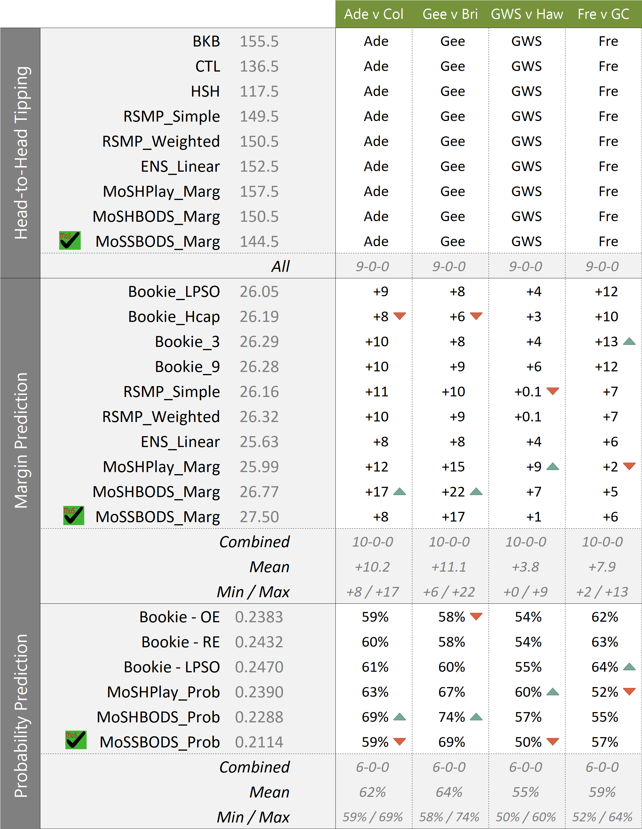 MoSHPlay is sticking with the Crows by 2 goals as its final forecast, and now also has preliminary views about the remainder of the round.