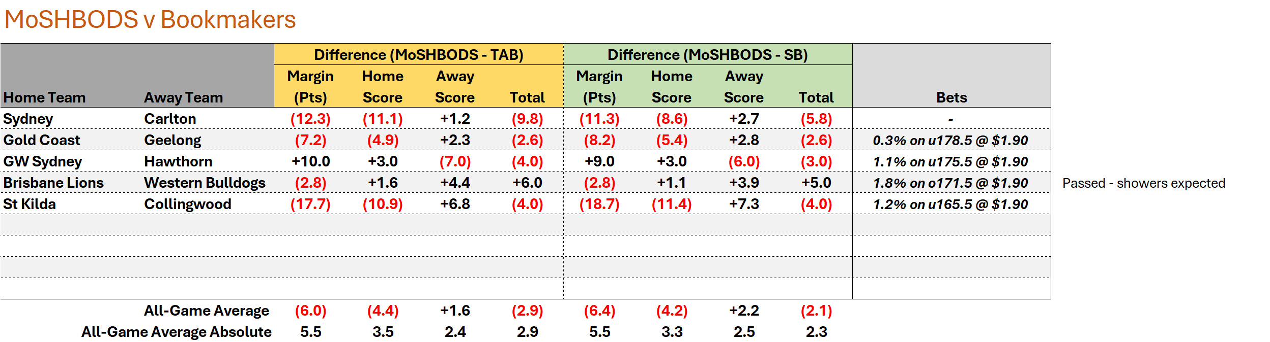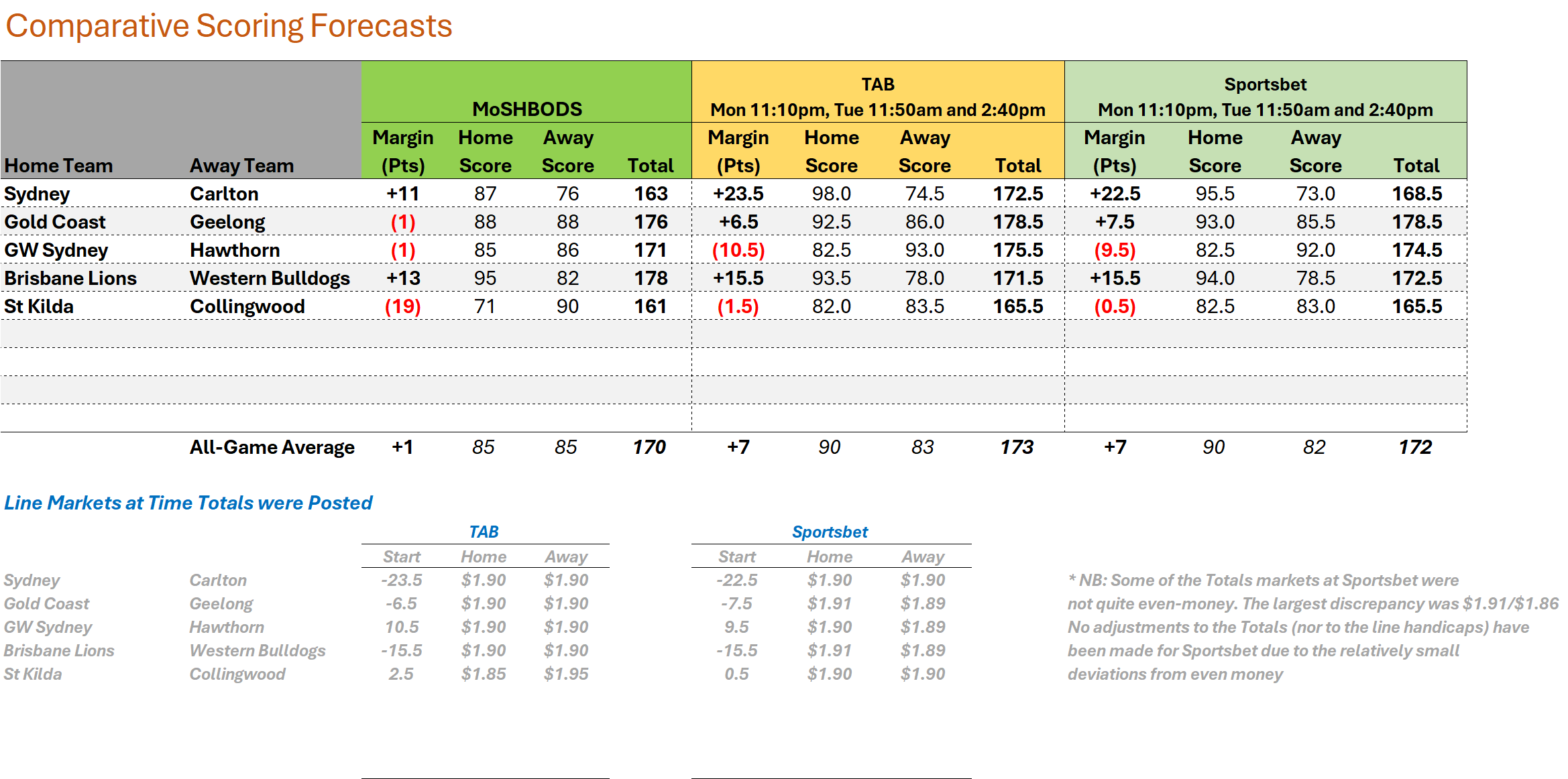 /MoSHBODS foresees lower scoring in every game of Round 0 except in the Lions v Dogs clash and, overall, has about a half-goal lower average Total than the two bookmakers.