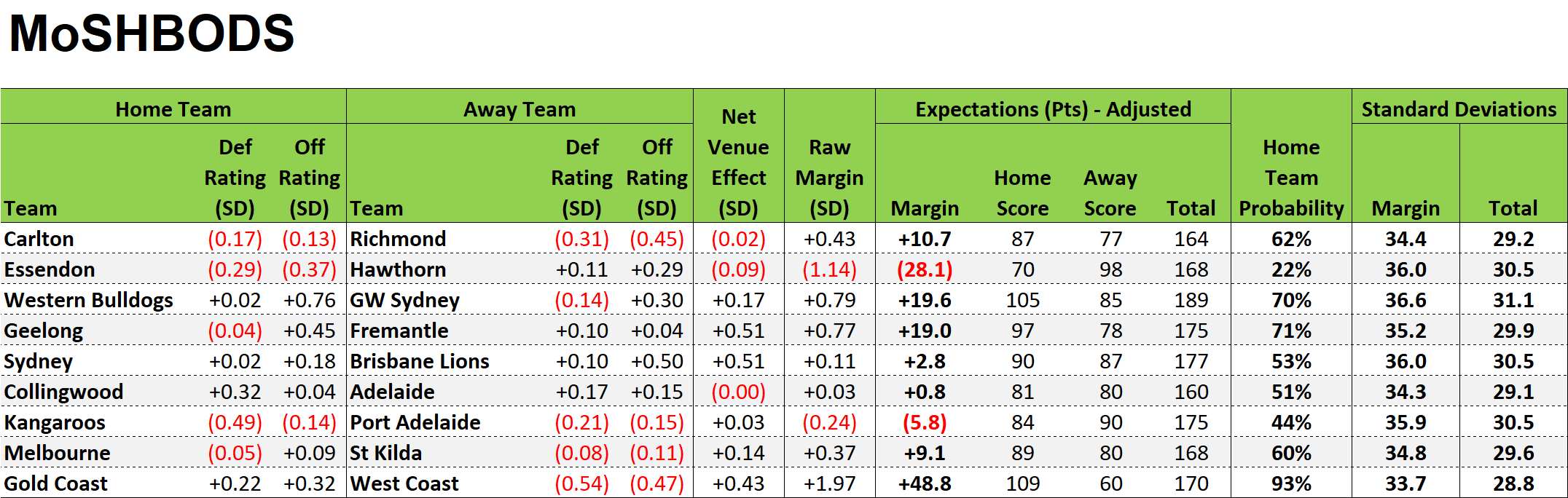 To finish, here are MoSHBODS’ and MARS’ opinions about likely team scoring.