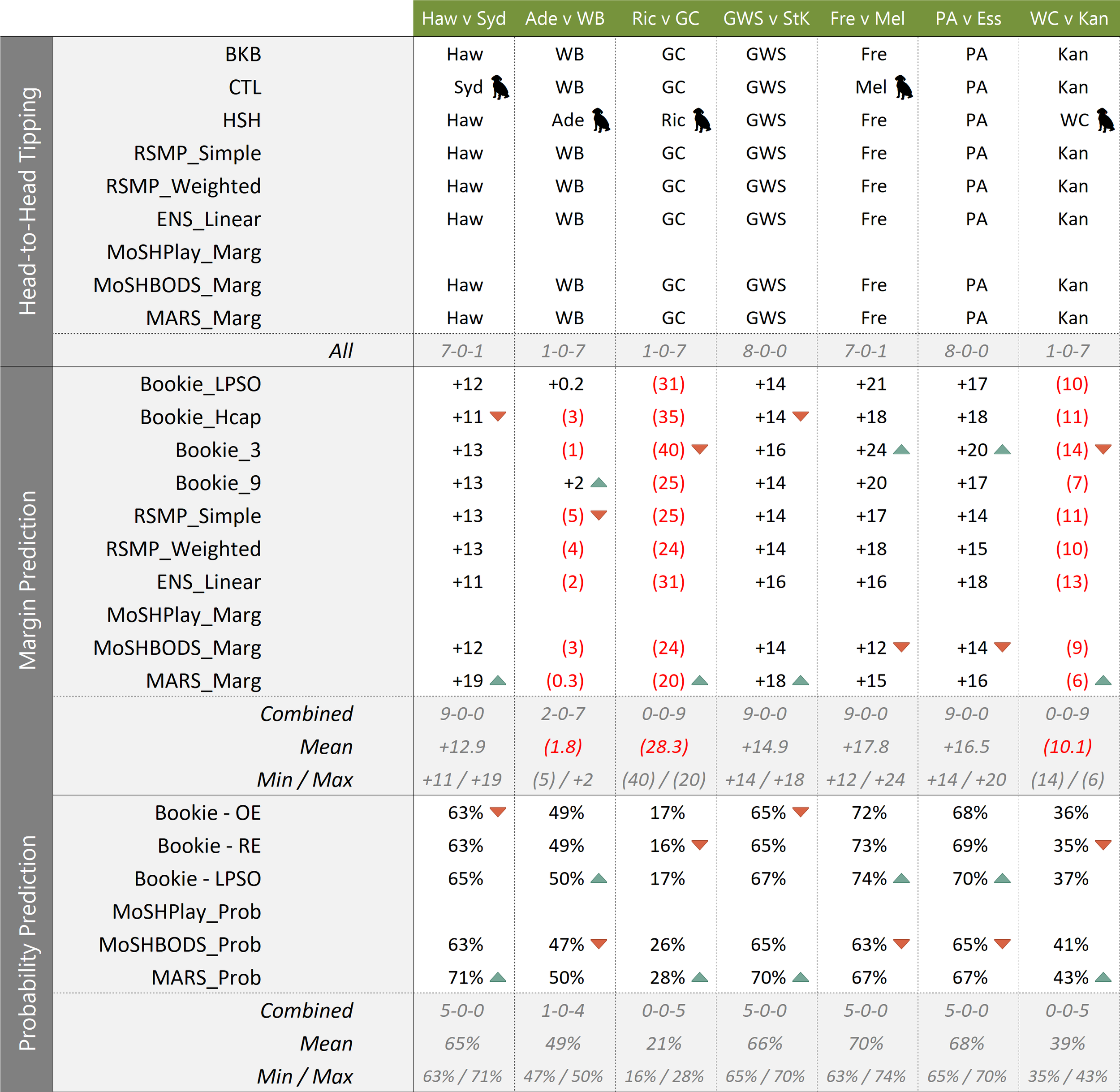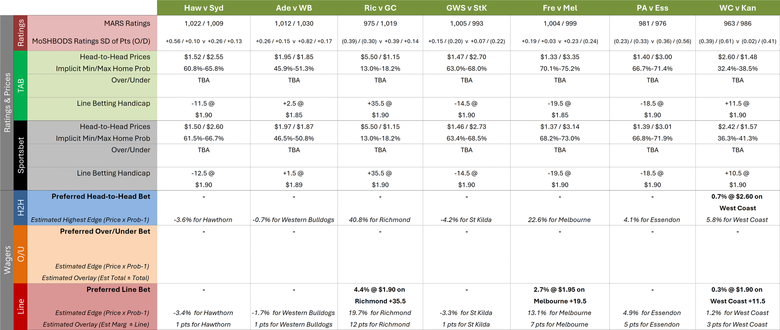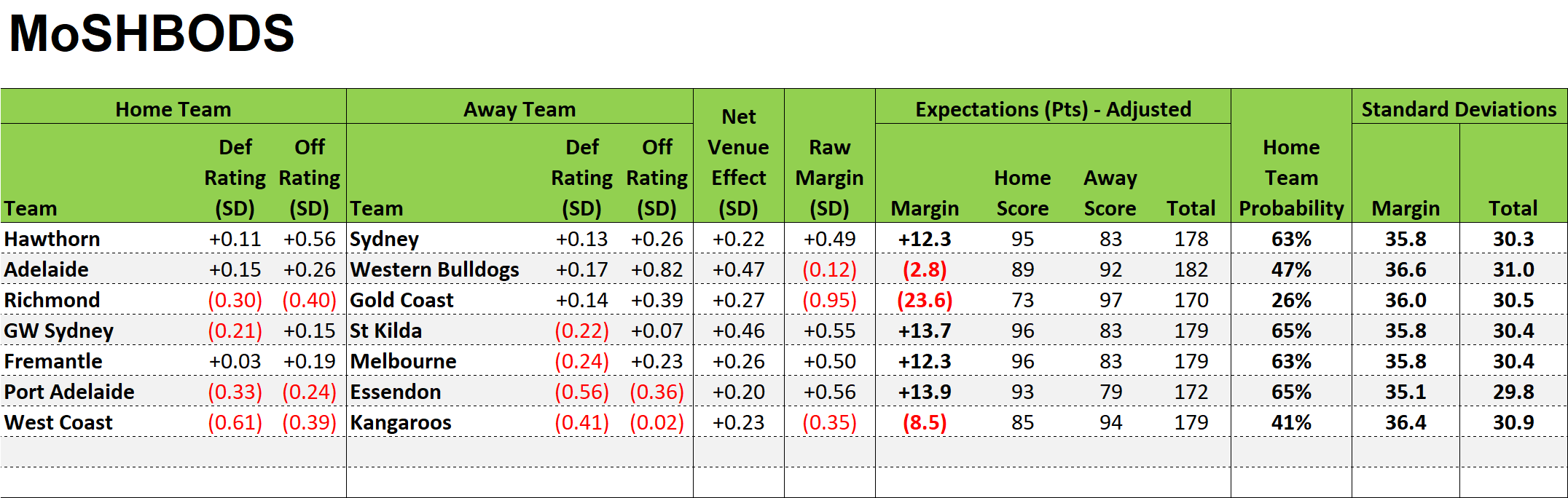 Commentary about the MoSHBODS’ Totals forecasts will come in the week's Overs/Unders blog and MoSHPlay’s various forecasts will be posted after the relevant team line-ups are made public.