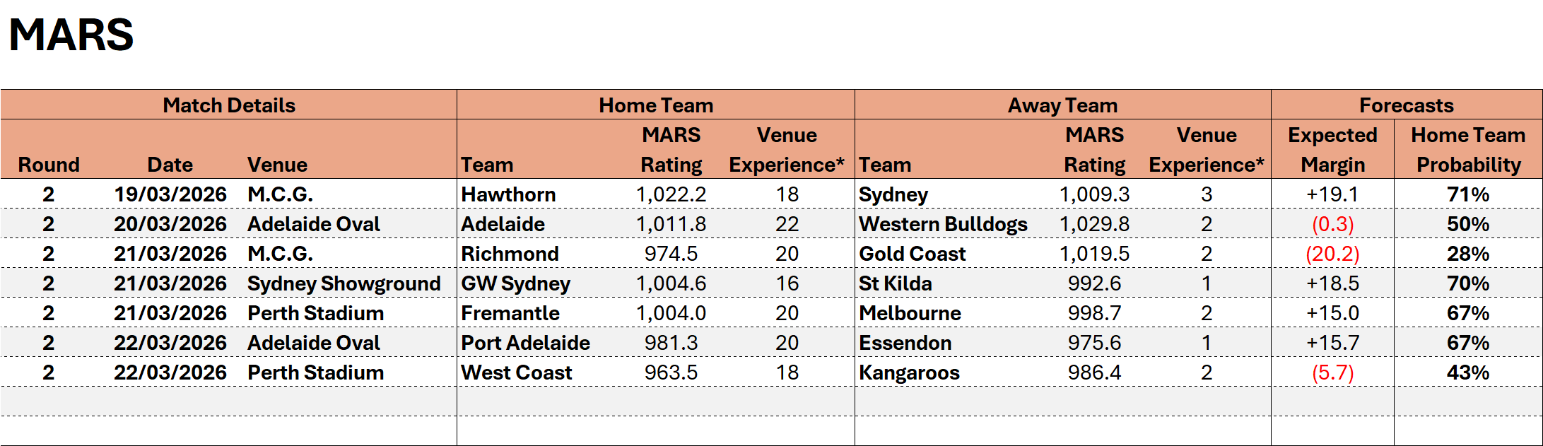 To finish, here are MoSHBODS’ and MARS’ opinions about likely team scoring.