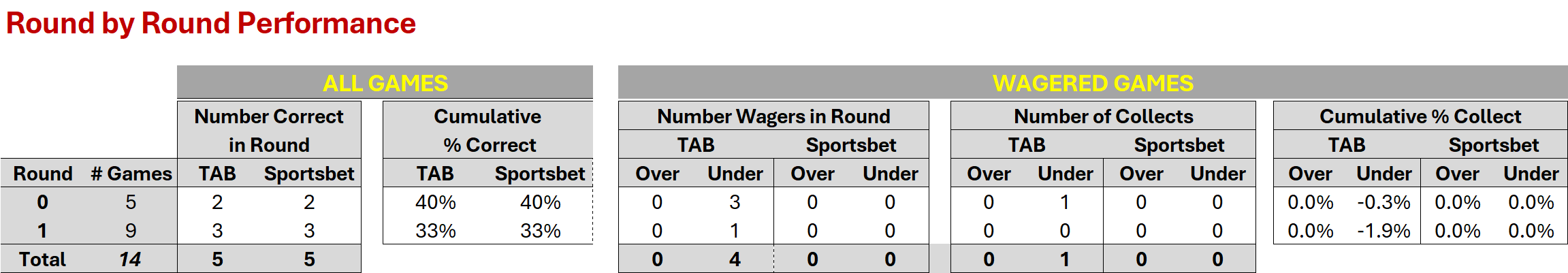 There was only one bet last weekend, which was an unsuccessful unders wager with the TAB. That left MoSHBODS at 1 and 3 against the TAB and yet to favour Sportsbet with a wager.