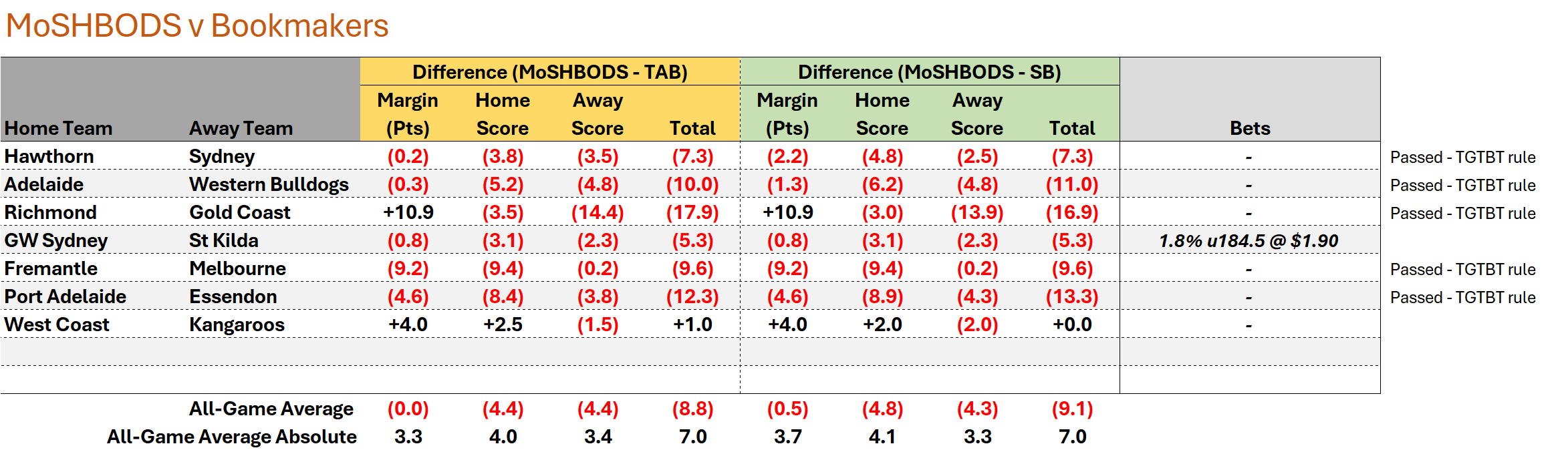 Overall, MoSHBODS was on the right side of the TAB and Sportsbet in only 3 games last week.