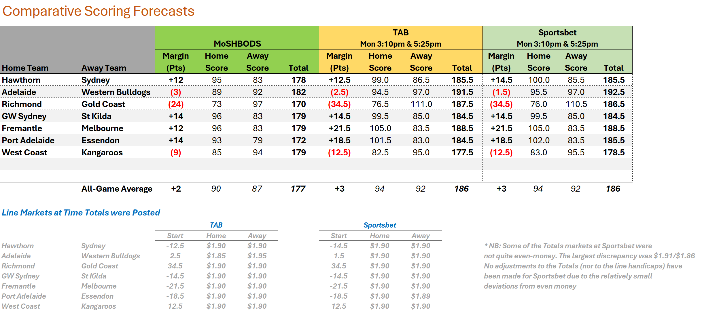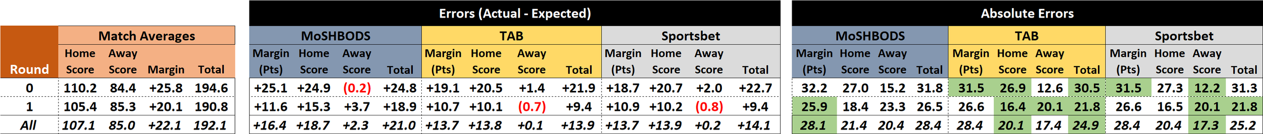 Last week saw the TAB take mean absolute error (MAE) honours for Home Team Scores and share honours for Away Team Scores and Game Totals with Sportsbet, leaving honours for Game Margins to be taken by MoSHBODS. Those results left the TAB leading season-long on Home Team Scores and Game Totals, Sportsbet leading on Away Team Scores, and MoSHBODS leading on Game Margins.