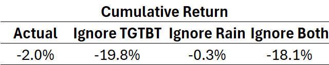 Ignoring the rain rule for the one game in which it has so far applied would have added about 1.7c to the value of the Fund, but ignoring the TGTBT rule in the eight games where it has applied would have snipped almost 18c off the value of the Fund. The TGTBT rule has therefore been very advantageous.