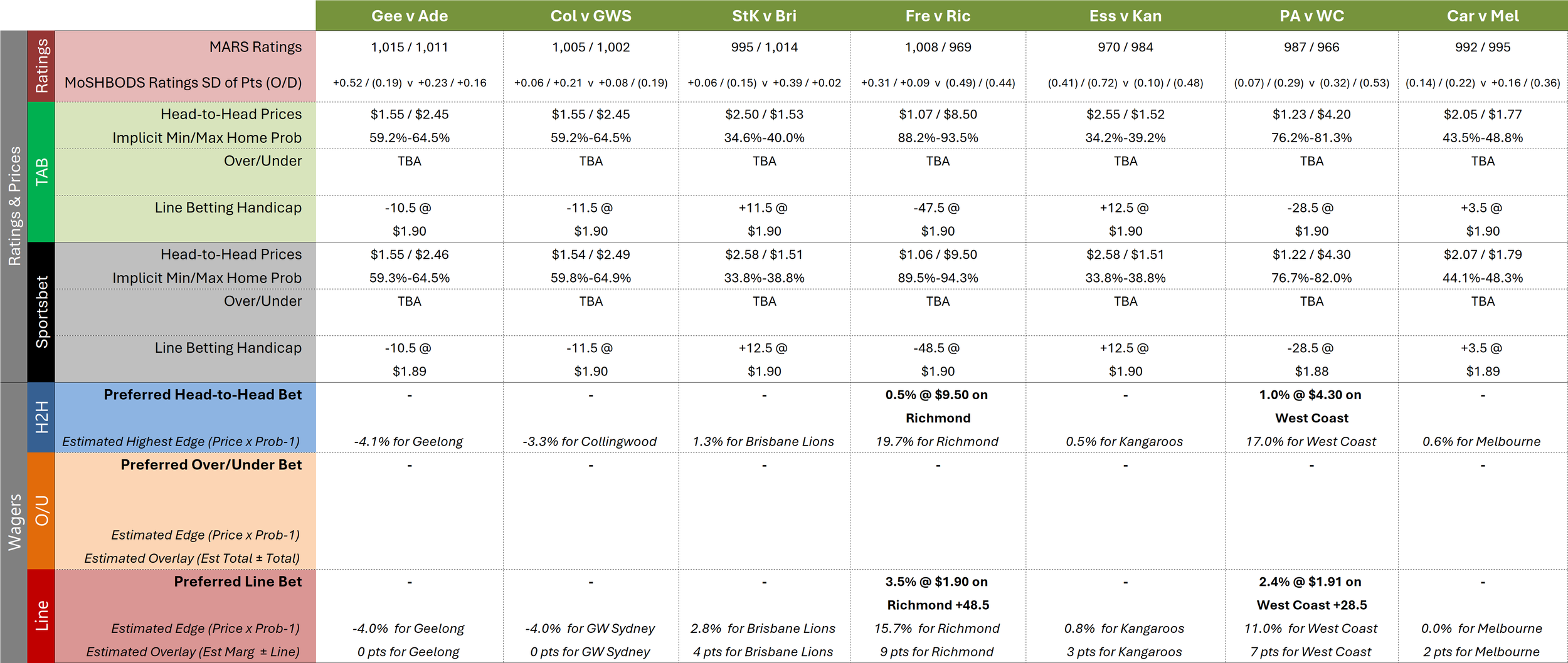 Commentary about the MoSHBODS’ Totals forecasts will come in the week's Overs/Unders blog and MoSHPlay’s various forecasts will be posted after the relevant team line-ups are made public.
