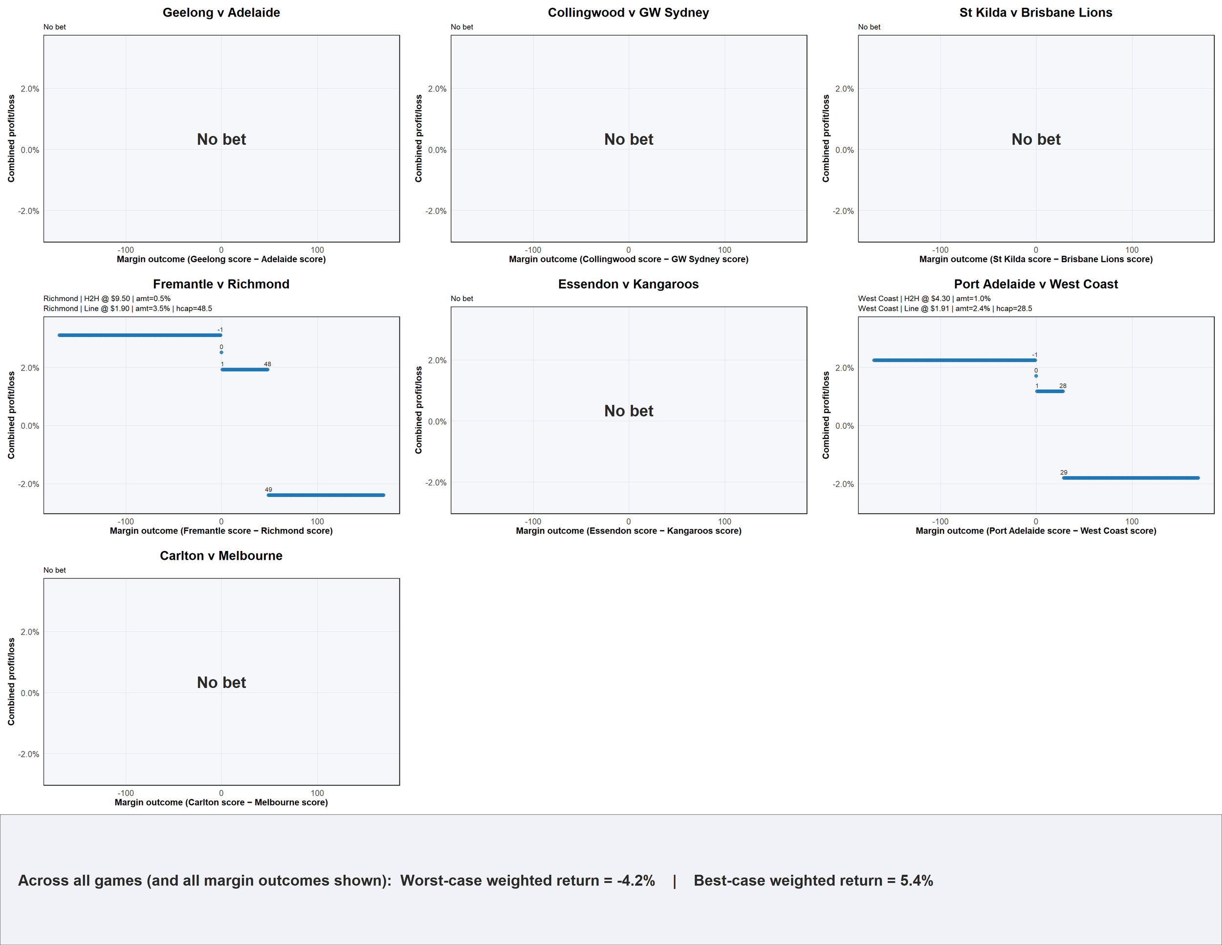 There are just three home favourites with an average expected victory margin of just over 8 points per game, and four away team favourites with an average expected victory margin of 23.5 points per game.