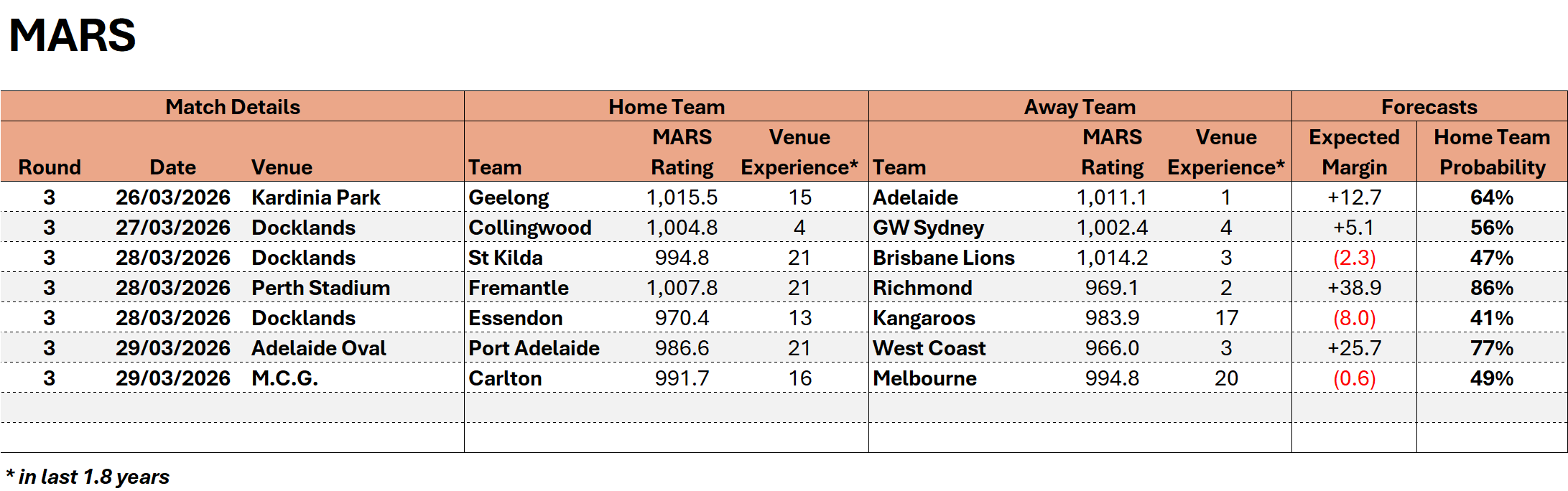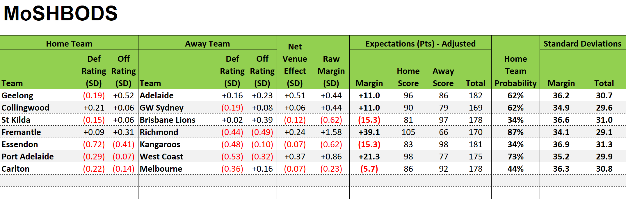 To finish, here are MoSHBODS’ and MARS’ opinions about likely team scoring.