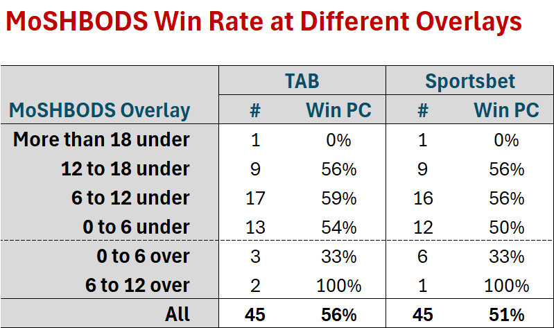 There were no bets last weekend, which left MoSHBODS at 3 and 3 against the TAB and at 0 and 1 with Sportsbet.