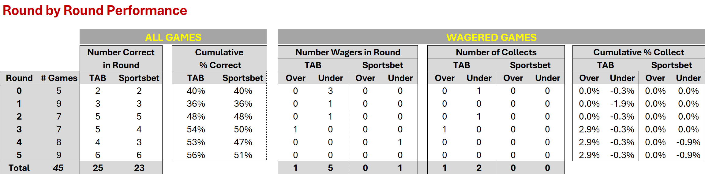 Game Totals: Sportsbet 6 points ahead of the TAB, and 43 points ahead of MoSHBODS