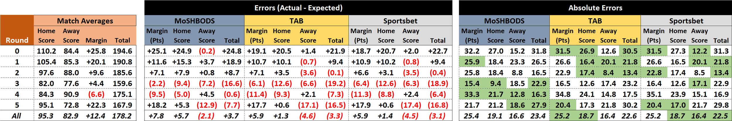 Away Team Scores: Sportsbet 2 points ahead of the TAB, and 9 points ahead of MoSHBODS