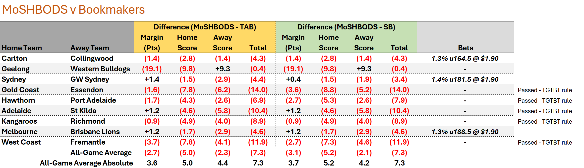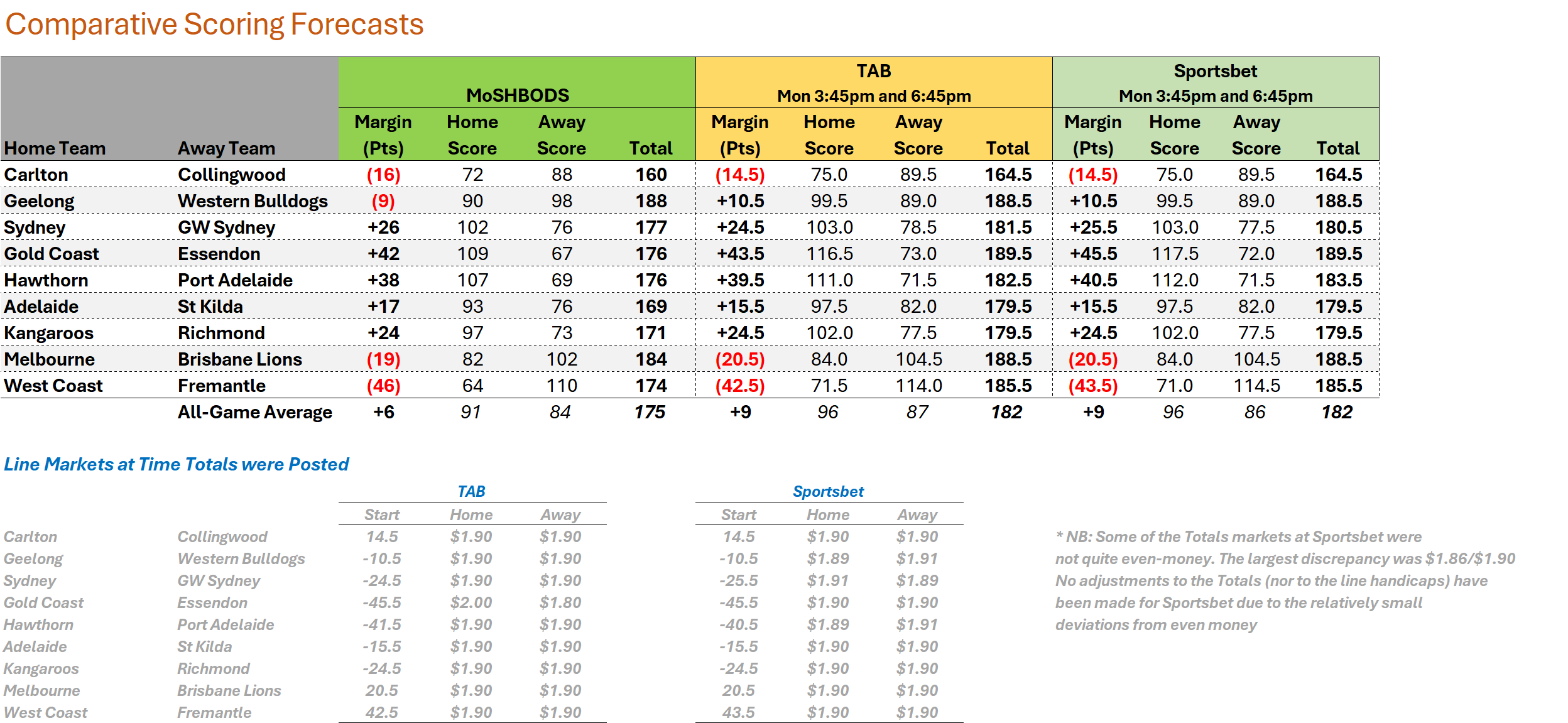 /MoSHBODS again feels that the bookmakers have gone too high with their Totals in every game this week, and has an all-game expected Total of 175 points per game compared to TAB’s and Sportbet’s 182.