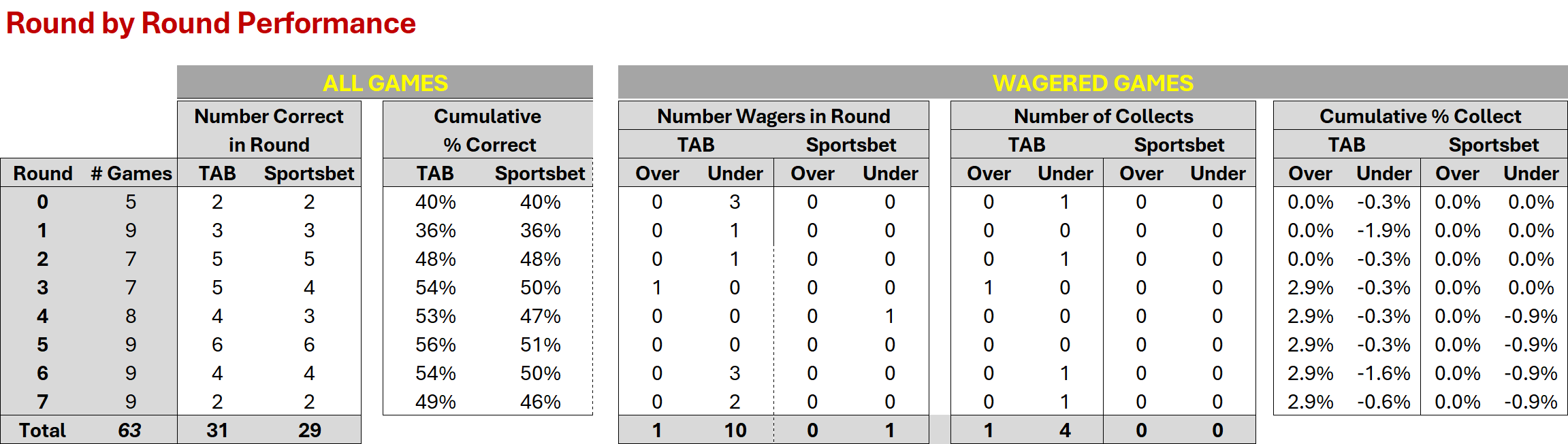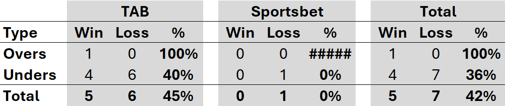 There were two bets last weekend, both unders and both with the TAB, only one of which was successful. That left MoSHBODS at 5 and 6 against the TAB and at 0 and 1 against Sportsbet.
