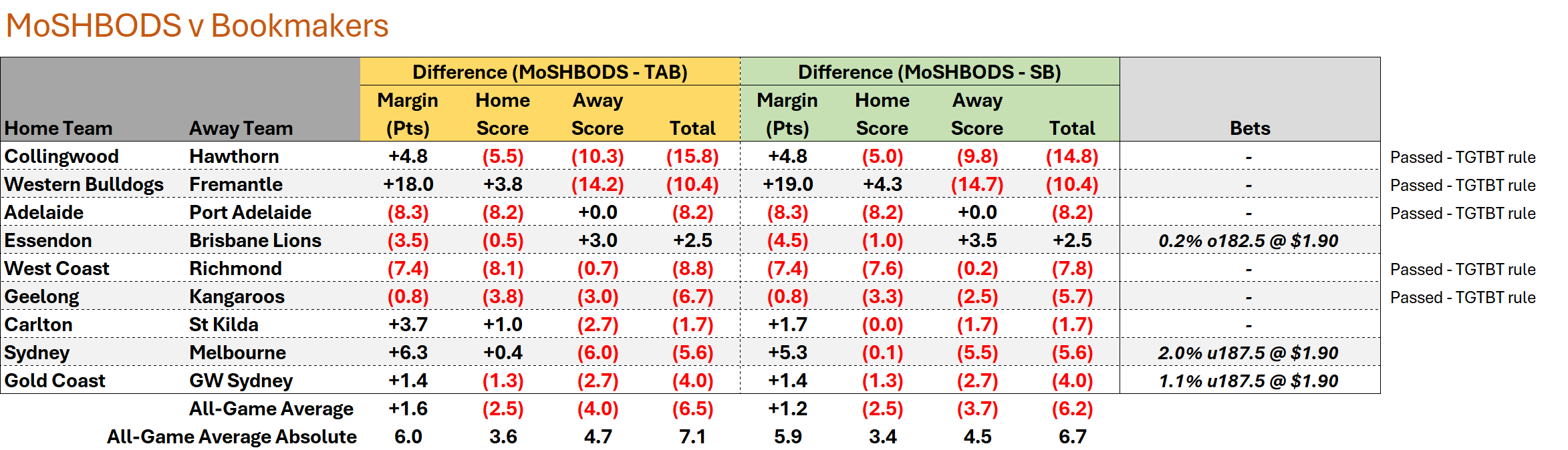 This week, MoSHBODS is a little closer to the bookmakers’ views in a few games - and even expects a higher score than them in one game - but still has an all-game expected Total that is about a goal less than both the TAB and Sportsbet.