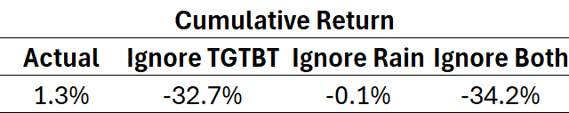 The table at right shows what the Overs/Unders Fund would currently be worth had we enforced only some or all of the veto rules. For the second time last week, the TGTBT rule saved Investors a good deal of money. Without them, right now the Overs/Unders Fund would have a price just under 66c.