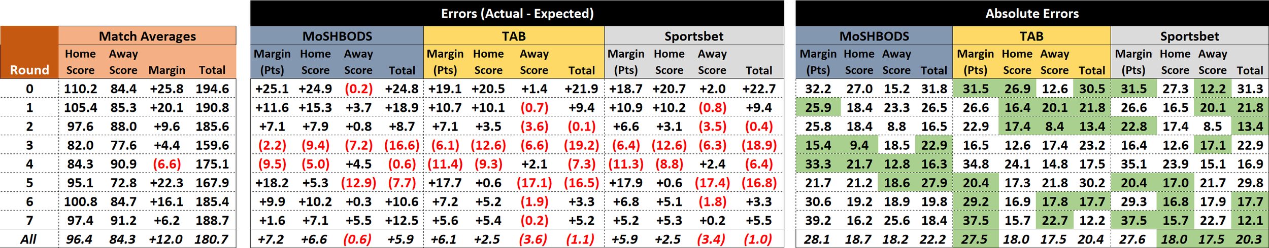 Last week saw the TAB take mean absolute error (MAE) honours for Away Team Scores and Sportsbet take them for Home Team Scores and Game Totals, while the TAB and Sportsbet shared them for Game Margins. That allowed Sportsbet to retain season-long leadership on Home Team Scores, Away Team Scores and Total Scores, and the TAB to retain the lead on Game Margins.