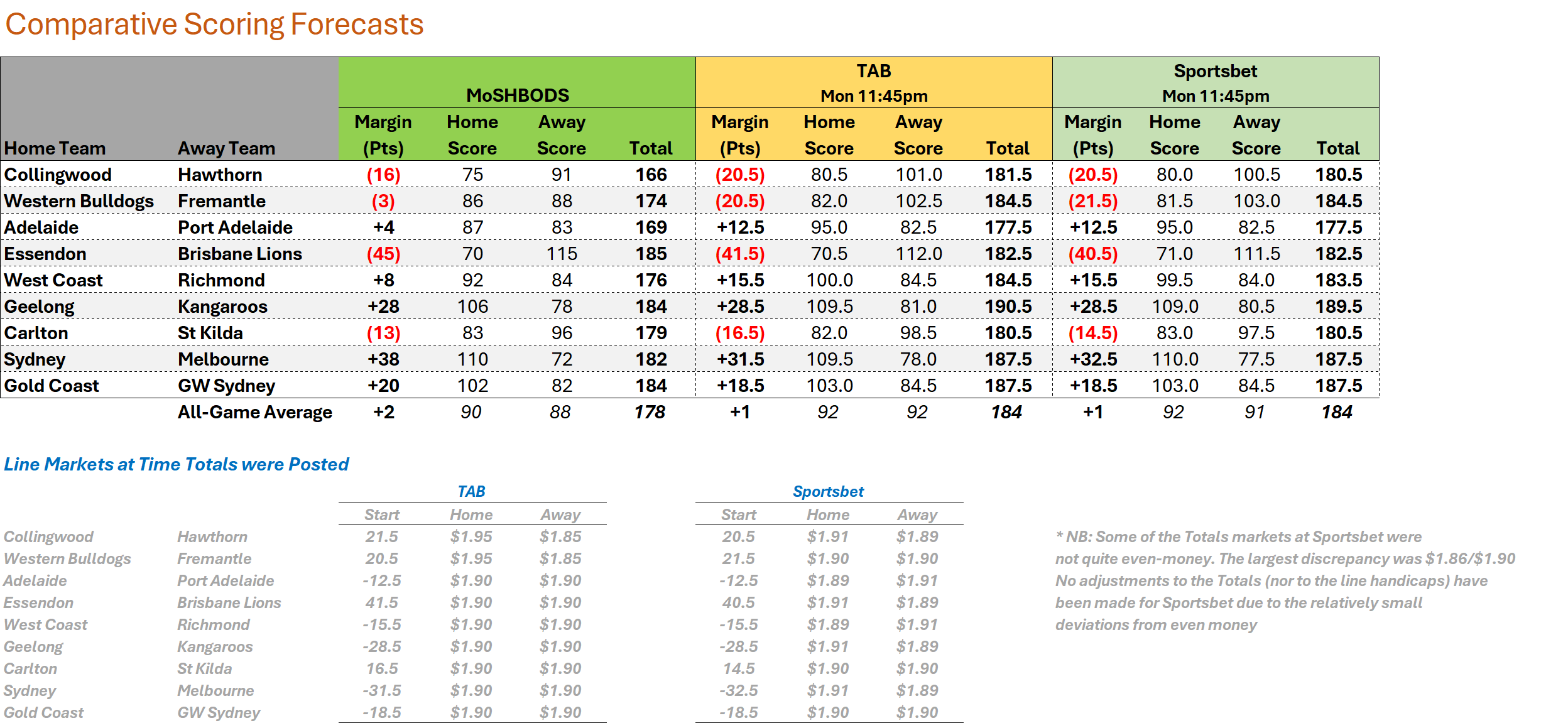 Game Margins: TAB 2 pointa ahead of Sportsbet and 38 points ahead of MoSHBODS