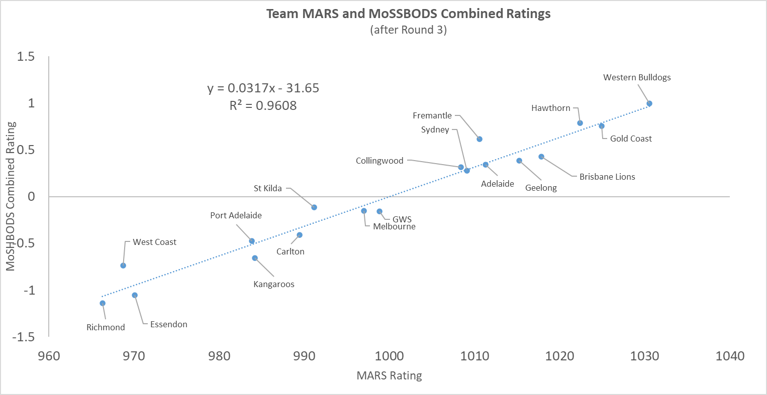 The correlation between MoSHBODS’ Combined Ratings and MARS’ Ratings stands at +0.98 and, roughly speaking, each team’s Combined MoSHBODS Rating is about 0.032 times its MARS Rating less 32.