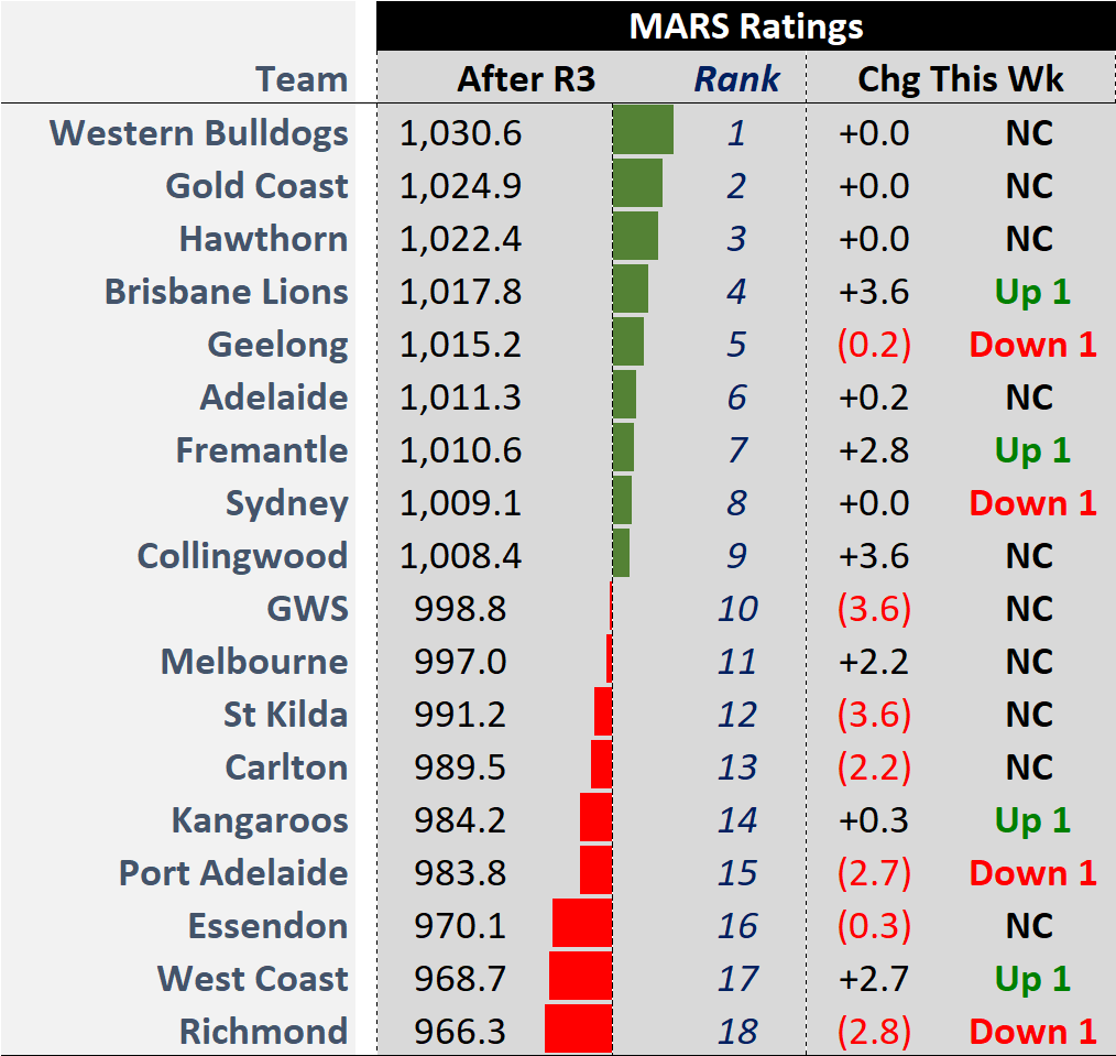 MARS now only has nine teams rated better-than-average, after which there is GWS at 998.8, and Melbourne at 997.