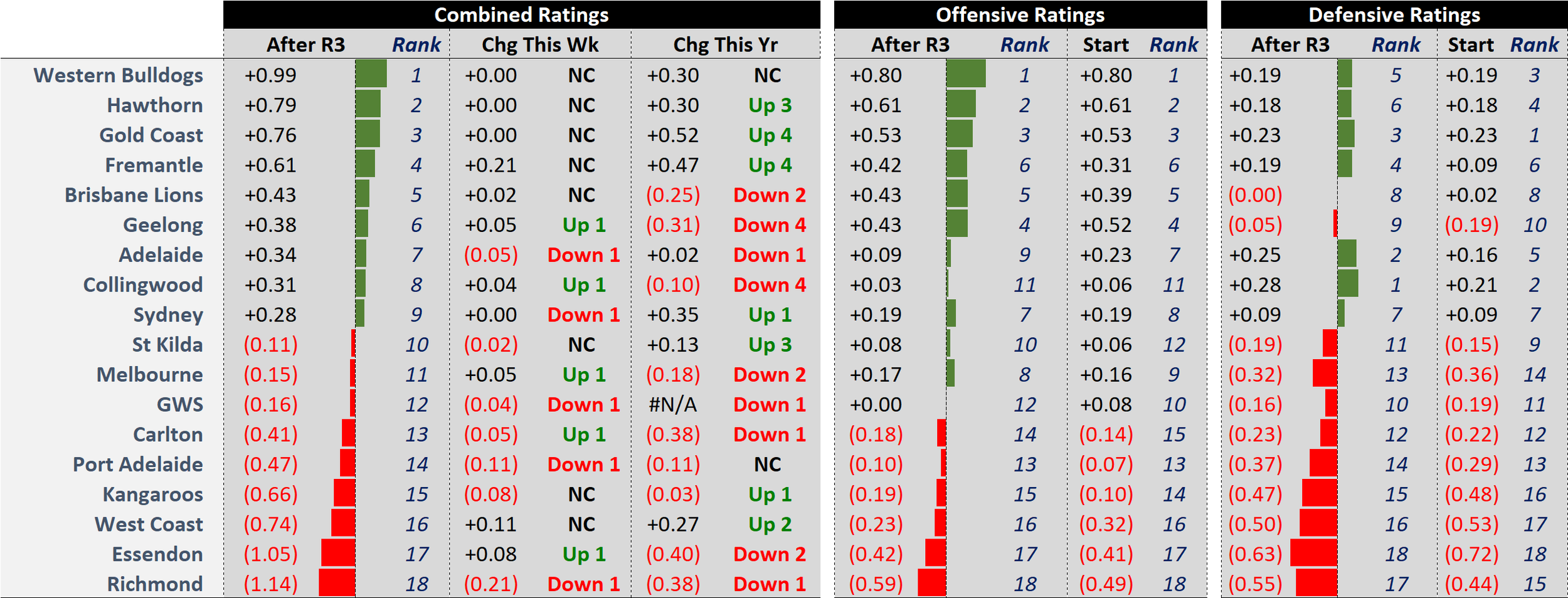 On the Component Ratings, on offence we find MoSHBODS still with a Top 3 of Dogs, Hawks, and Suns, while on defence it has a Top 3 of Pies, Crows, and Suns. Twelve teams are rated as above average on offence and only seven on defence.