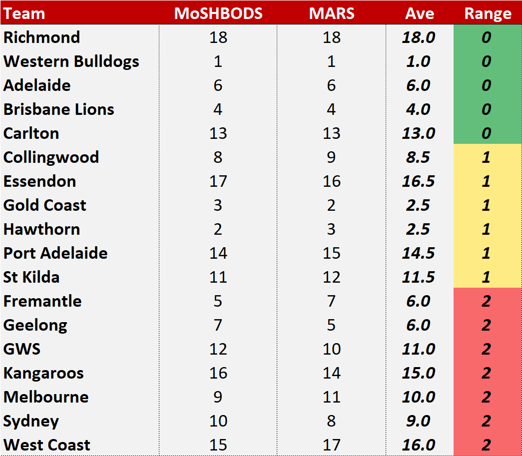 MoSHBODS and MARS agree about the ranking of five teams now, and differ by no more than two spots about the remaining of any team.